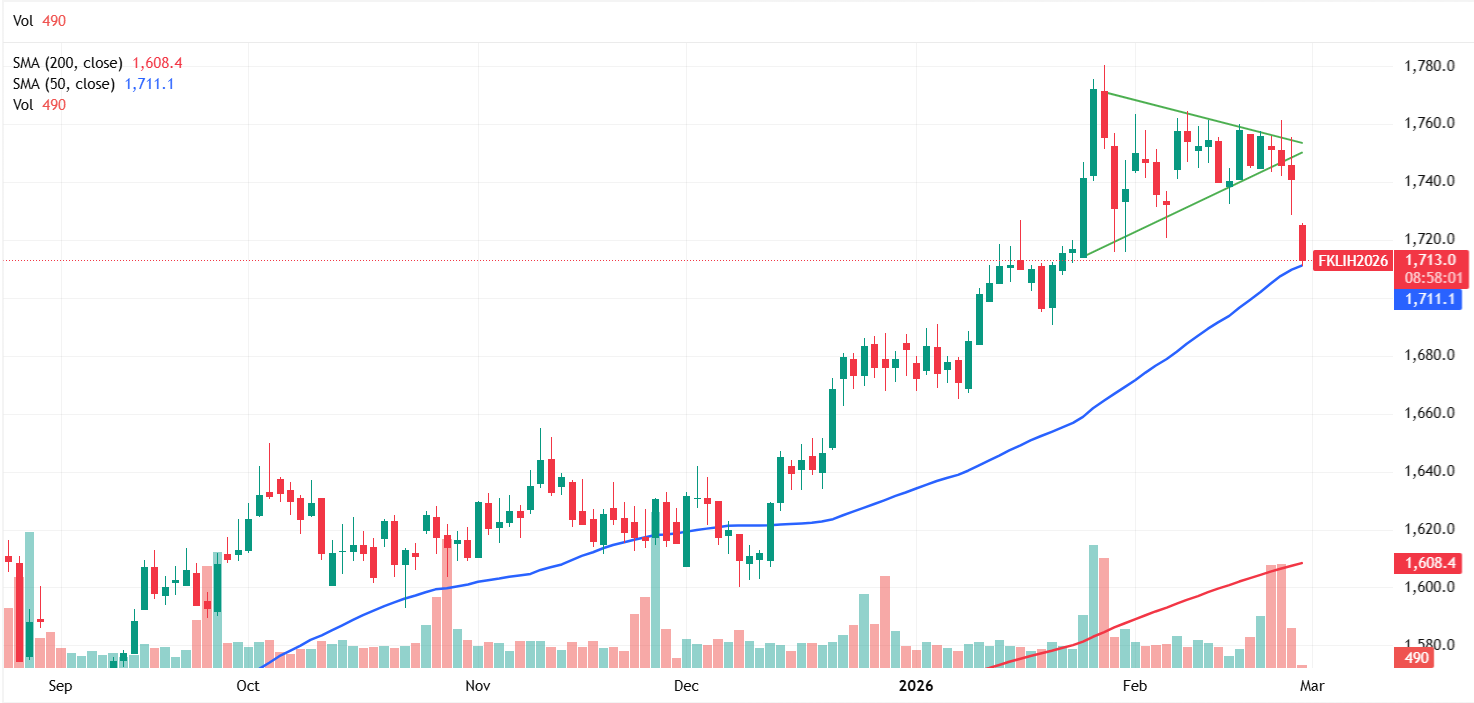 The active FKLI contract has broken out of its triangle pattern, signaling that a corrective phase may be underway. On the 30-minute chart, prices have slipped below the sideways support zone around the 1723-1720 level. If the market fails to stage a rebound from this area, it could trigger downside movement.