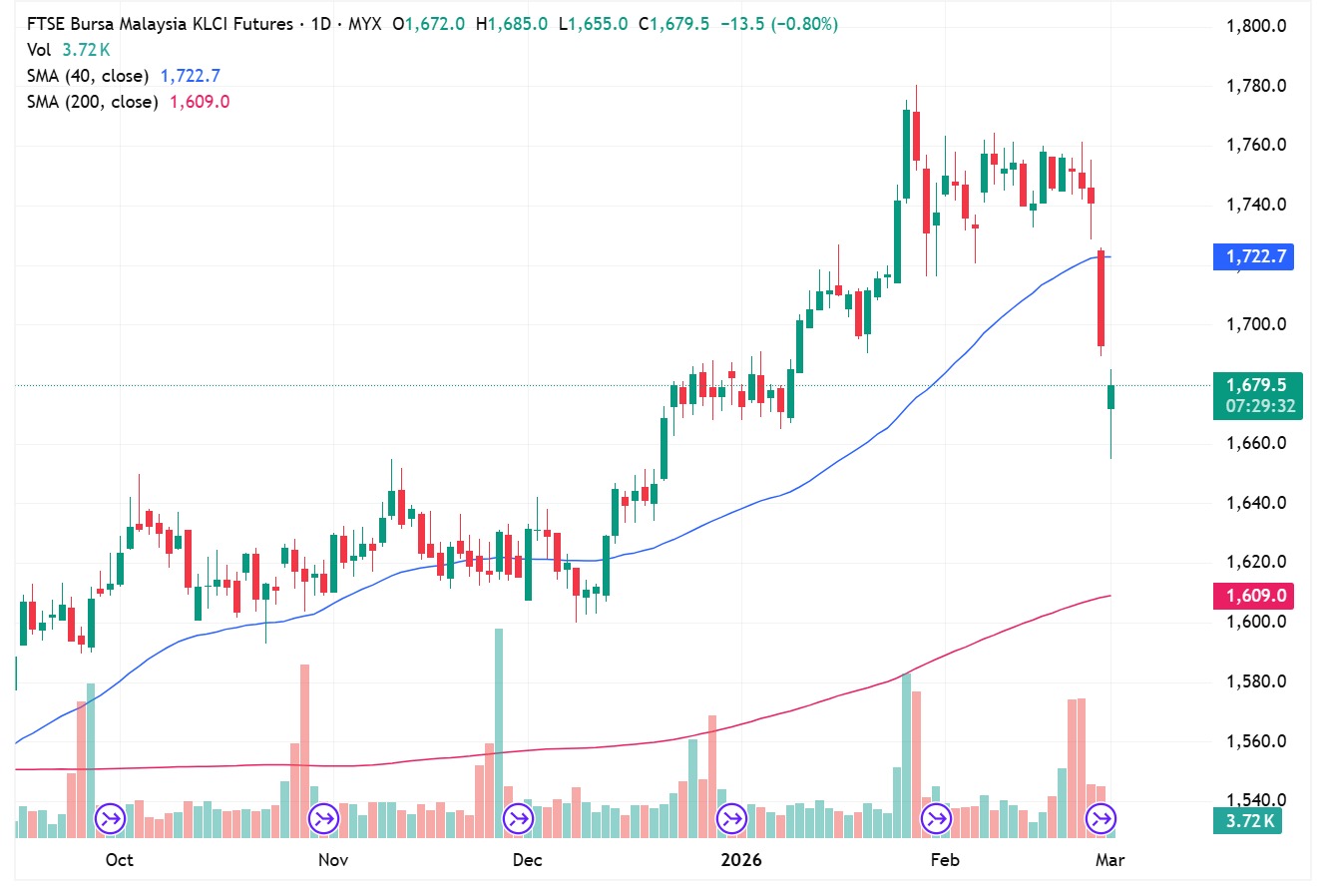 FKLI Mar month dipped 38 points or 2.24% at opening to the low at 1655. The index weakened strongly as the ongoing US-Israel-Iran war over the weekend has created panic selling.