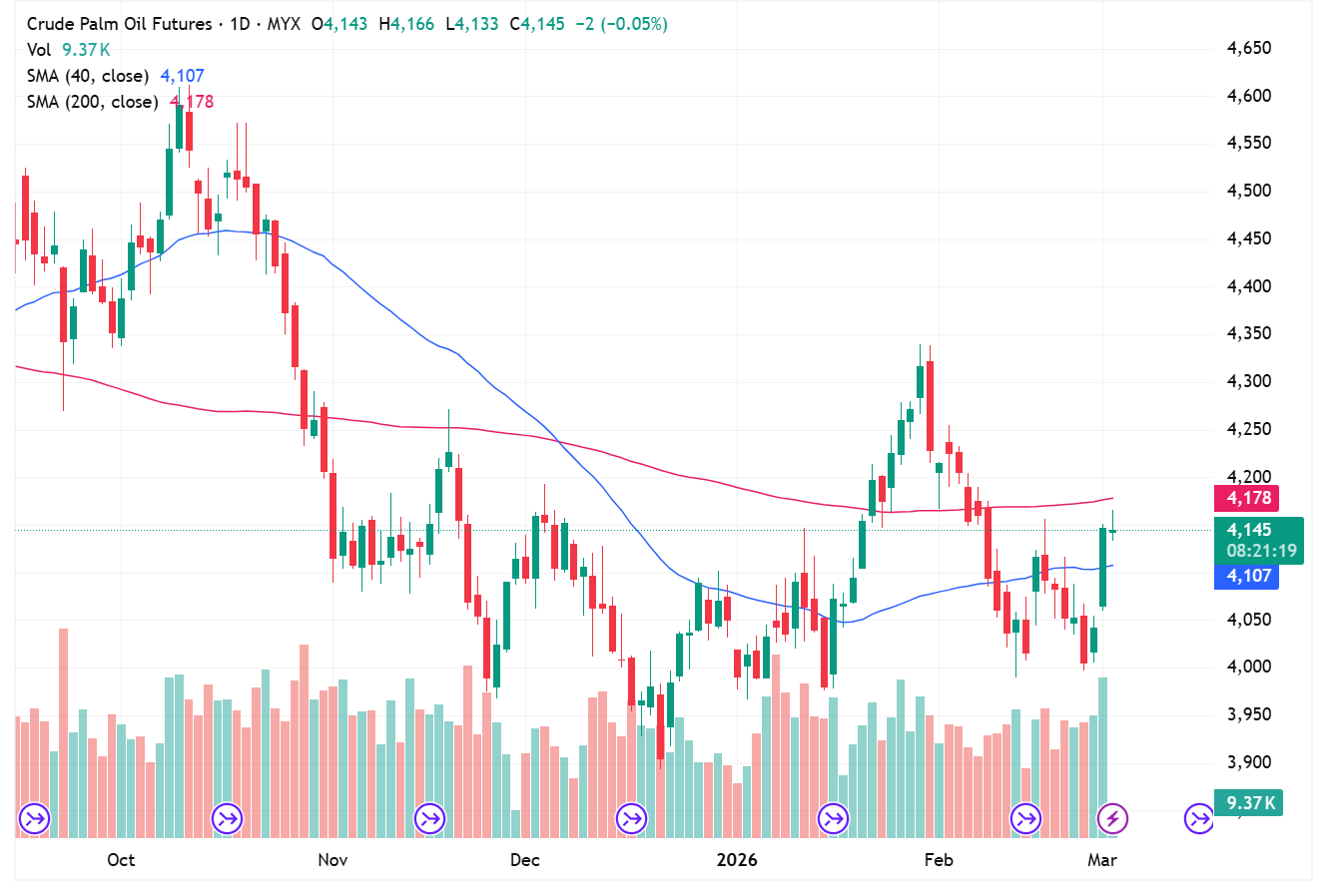 The active FCPO contract showed further buying momentum to follow Friday’s reversal candle. In the daily chart, a substantial bullish candle closed on Friday despite a strong selling on Thursday indicating a supportive momentum in building. The support has shifted high to the 4100 mark from earlier 4000 level. A potential follow through may be expected to test 4200 today. Immediate support and resistant levels are identified at 4100 and 4170 respectively. Beware of any potential sentiment changes.