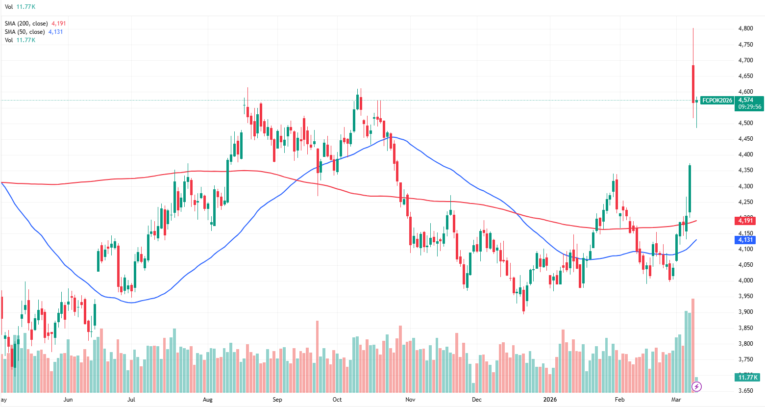 FCPO May month surged 200 points or +4.58% to closed at 4567 in previous session. Palm oil surged as much as 10%, soybean oil jumped and wheat neared a two-year peak, as the war in the Middle East drove energy and fertilizer costs higher and threatened to tighten supplies across agricultural markets.
