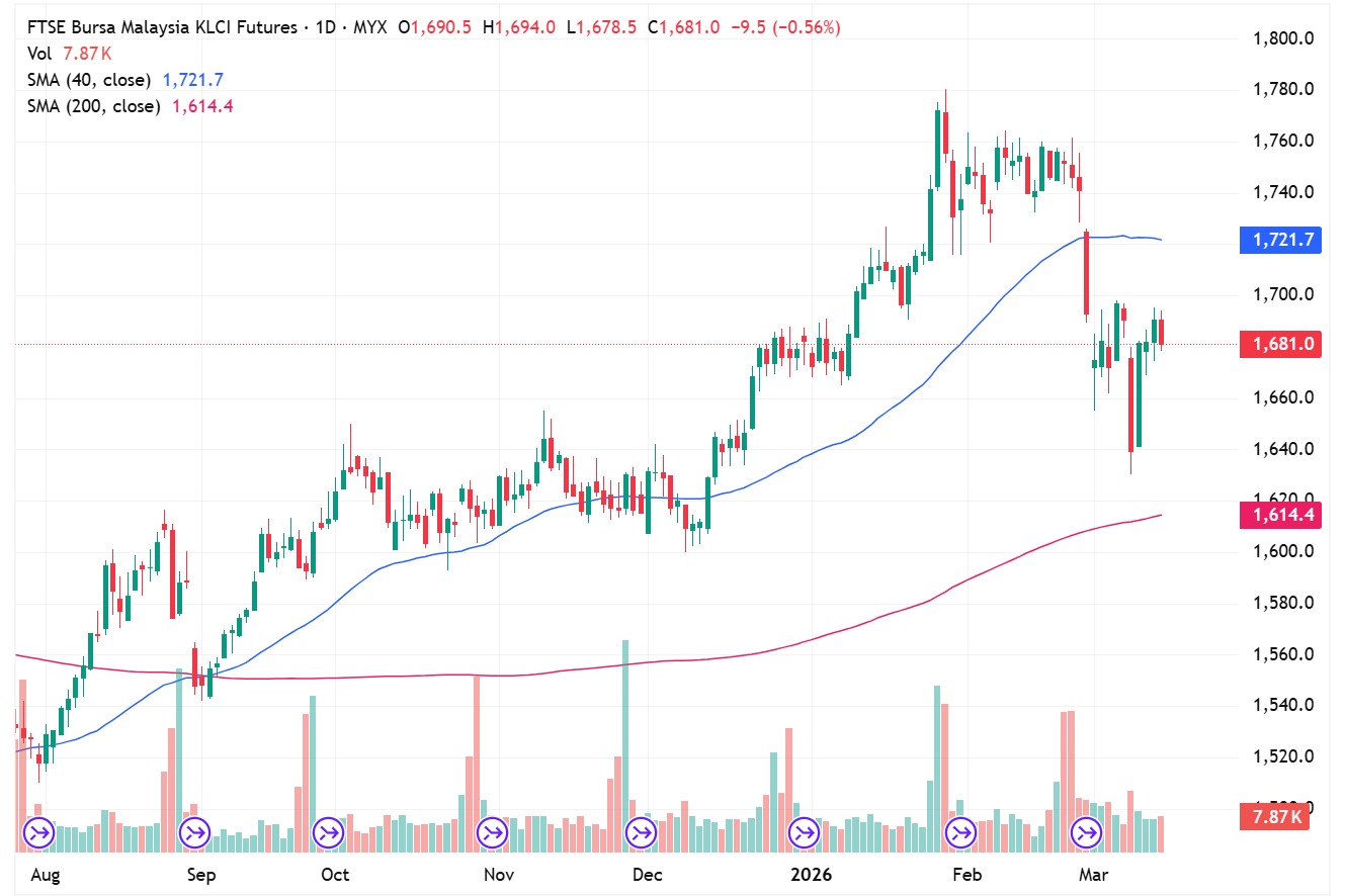 FKLI Mar month dropped 9.5 points or 0.56% to closed at 1681. The index was mixed trading in last Friday session amid the ongoing Iran conflict.