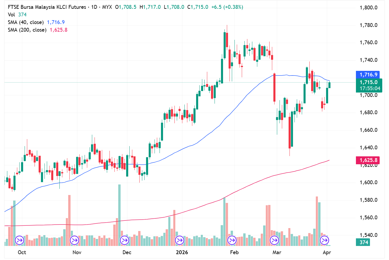 FKLI Apr month surged 19 points or 1.12% to closed at 1708.5 in previous session. The index turned positive amid good sentiment across regional market after Trump announced to end the war soon.