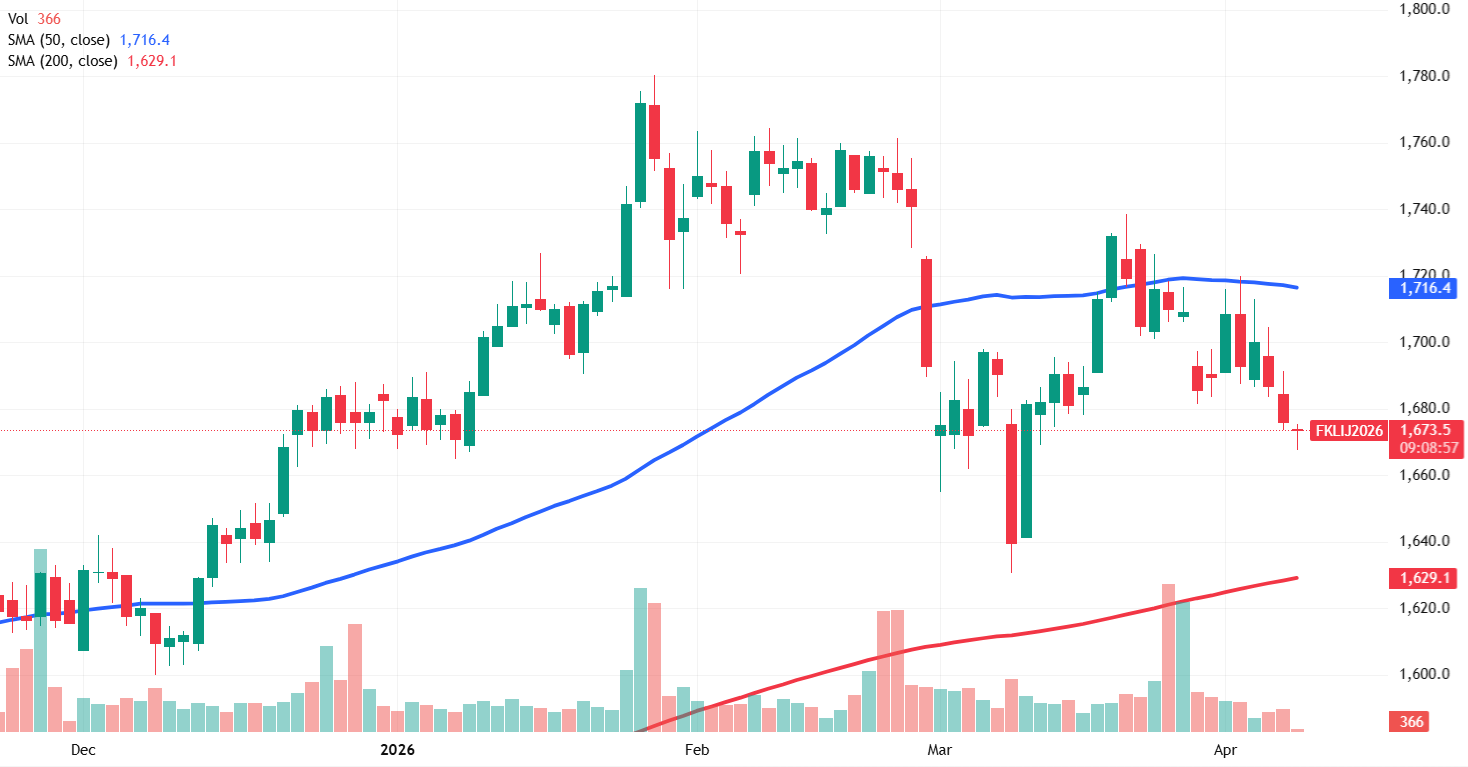 FKLI April month dropped 2.5 points or -0.15% to closed at 1673.5 on previous night session. The FBM KLCI fell 0.24% on Tuesday, marking its fourth straight day of declines as investors remained risk-averse amid heightened geopolitical tensions in West Asia, dampening overall market sentiment.