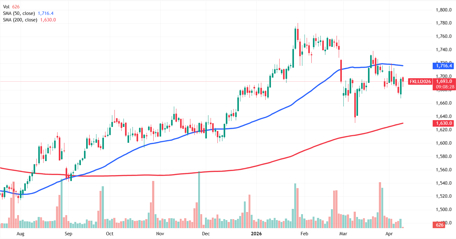 FKLI April month surged 20.5 points or +1.22% to closed at 1696.5 on previous session. The FBM KLCI rose 1.16% on Wednesday, ending its recent decline on bargain hunting and easing geopolitical tensions, although sentiment remains cautious amid lingering global risks. Market breadth was positive, with 874 advancers versus 393 decliners.