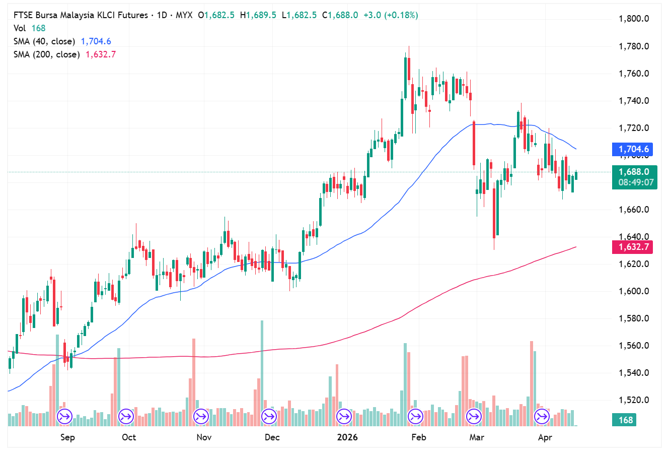 FKLI Apr month up 0.5 points or 0.03% to closed at 1685 in previous session. The index remained flat to supported despite unsettled ongoing US-Iran conflict.