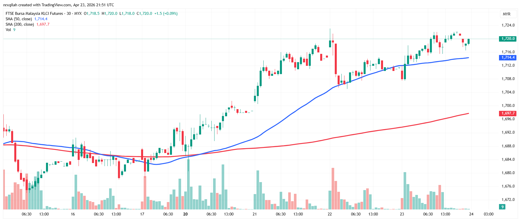 The active FKLI contract is trading near the SMA-50 (around 1706), showing immediate support at this level. Price remains above both the 50-day and 200-day moving averages, indicating that the longer-term trend remains positive. On the daily chart, price is consolidating after testing the 1720–1725 resistance zone, suggesting mild profit-taking but underlying bullish momentum is still intact. On the 30-minute chart, a break above 1720 may push price toward 1726–1732, while failure to hold above 1715 may lead to a pullback toward 1705–1700.