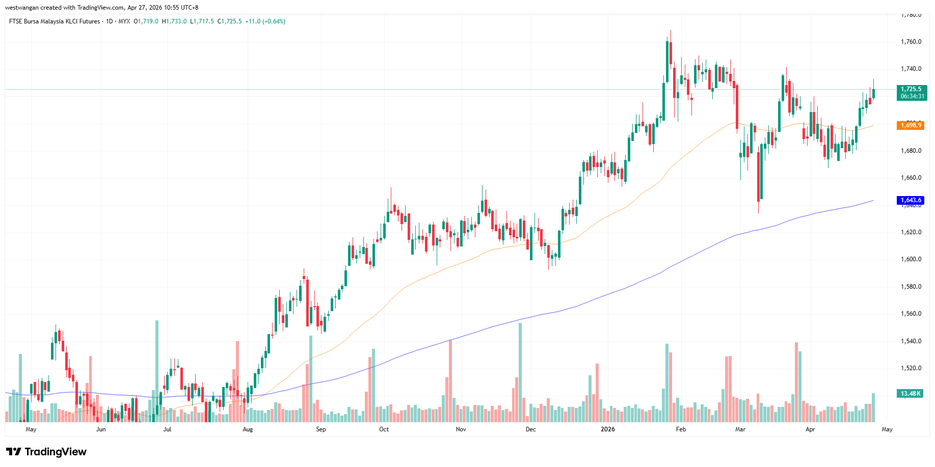 The active FKLI contract is now at 1729.5, breaking the previous resistance level and currently heading to a new resistance that has been mentioned. It opened with a strong bullish candle, indicating strong buying pressure for this market with the supporting from. In 30-minute chart, EMA line already shows that EMA 50 cross above EMA 200 that indicates buying signal.