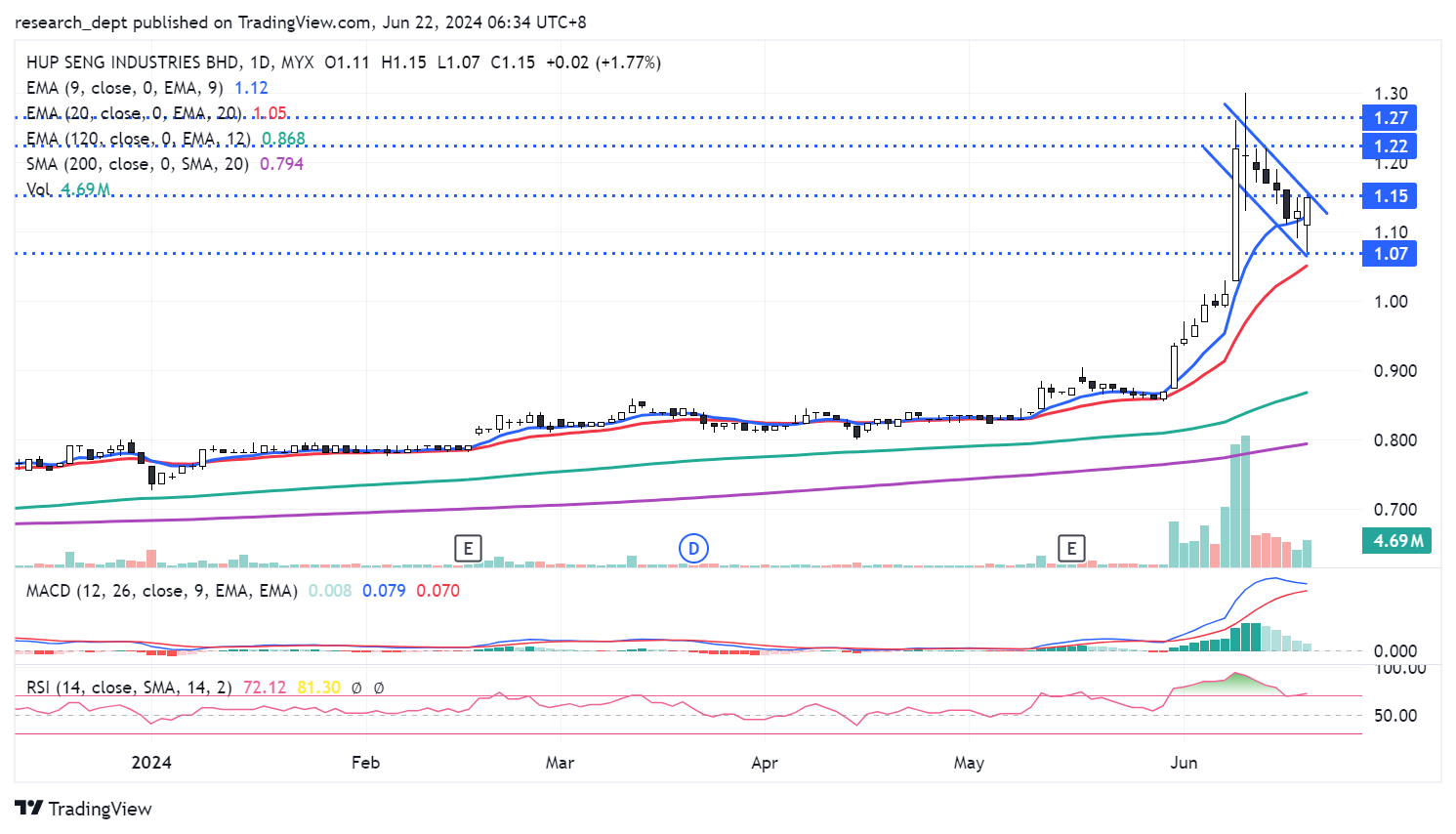 Price is on the longer-term uptrend formation and is mostly supported above EMA20 in recent months. Following the sharp gains in recent month, price staged a mild pullback towards EMA9. Traders may anticipate for a potential flag-formation breakout above RM1.15 to target the next resistances located at RM1.22-1.27. Downside wise, support is envisaged at RM1.07.