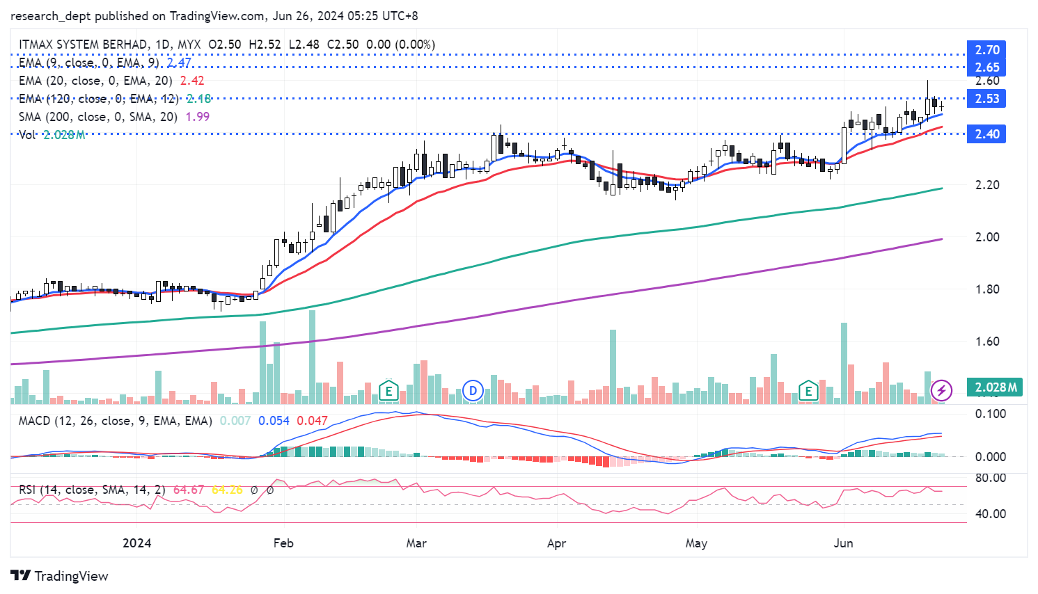 Price is on the longer-term uptrend formation since the start of the year. In recent weeks, we gathered that price has gradually marched higher and supported above EMA9. Traders may anticipate for a potential short-term breakout above RM2.53 to target the next resistances located at RM2.65-2.70. Downside wise, support is envisaged at RM2.40.