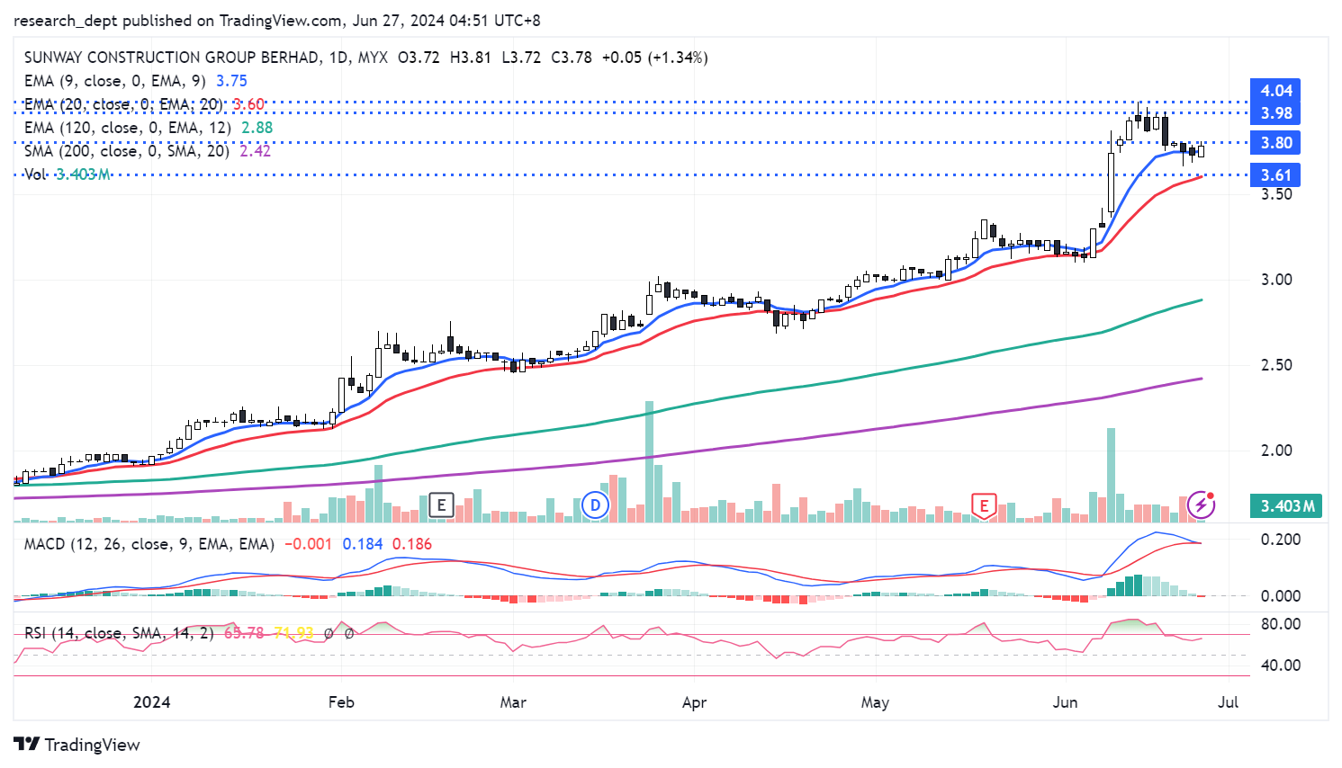 Price is largely on the uptrend formation over the longer-term perspective and mostly supported above EMA20. Price took a pullback towards EMA9 and consolidates in recent days. Traders may anticipate for a potential short-term breakout above RM3.80 to target the next resistances located at RM3.98-4.04. Downside wise, support is envisaged at RM3.61.