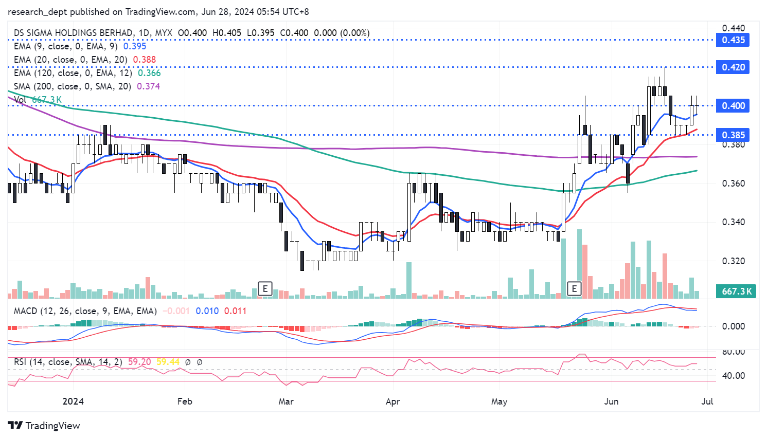 Price is on the rebound mode afrter stabilising mostly above SMA200 in recent months. Price gradually marched higher and rose above EMA9 recently. Traders may anticipate for a potential short-term breakout above RM0.40 to target the next resistances located at RM0.42-0.435. Downside wise, support is envisaged at RM0.385.