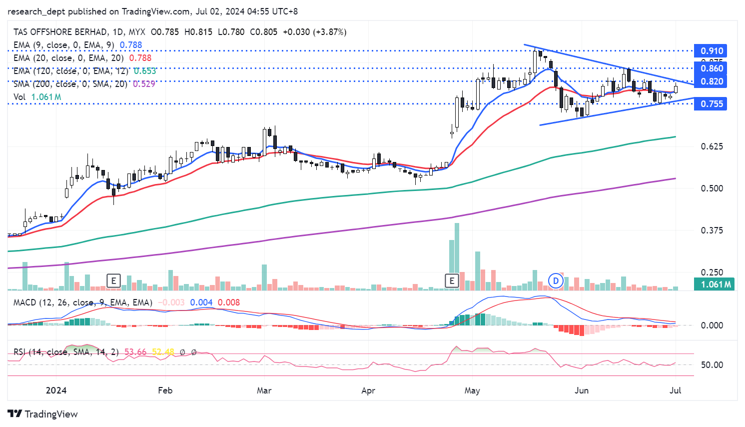 Price gas turned into a consolidation pattern in recent months, oscillating around EMA20. Price has recently recovered above EMA9 accompanied by mild improved in trading volumes. Traders may monitor for a potential triangle formation breakout above RM0.82 to target the next resistances located at RM0.86- 0.91. Downside wise, support is pegged at RM0.755.