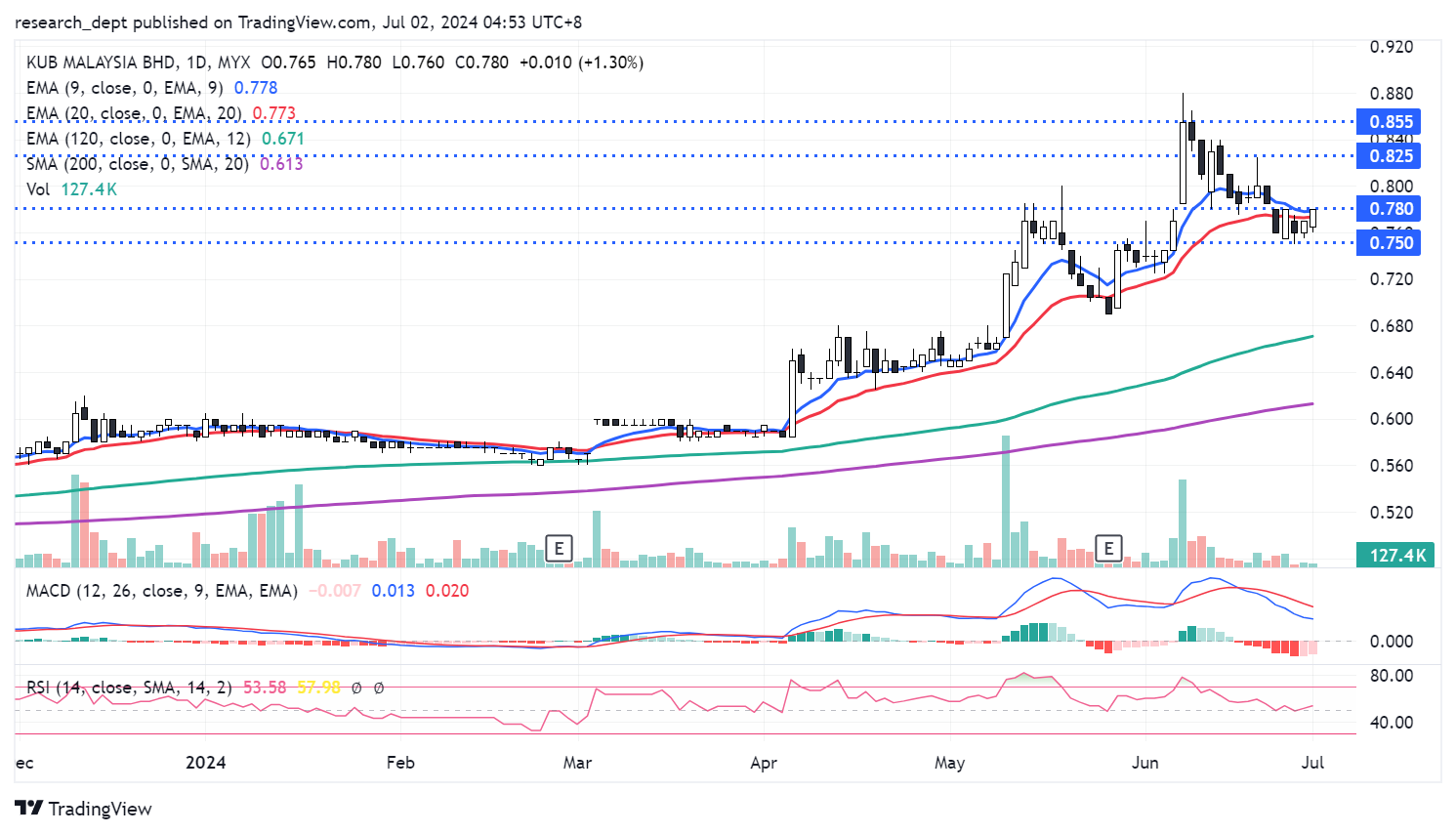 Price is on the uptrend formation, mostly supported above EMA20. After hitting the recent high in early last month, price has staged a mild correction before turning into a short-term consolidation. Following the recovery above EMA20, traders may anticipate for a potential short-term breakout above RM0.78 to target the next resistances located at RM0.825-0.855. Downside wise, support is envisaged at RM0.75.