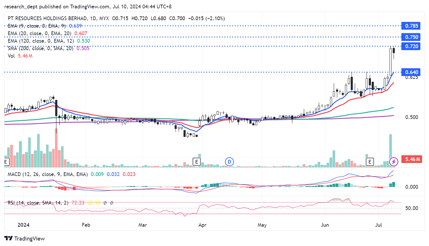 Price has formed the uptrend formation since late May 2024. With price largely supported above EMA20, price charged higher in recent days. Traders may monitor for potential follow through buying interest above RM0.72 to target the next resistances located at RM0.75-0.785. Downside wise, support is envisaged at RM0.64.