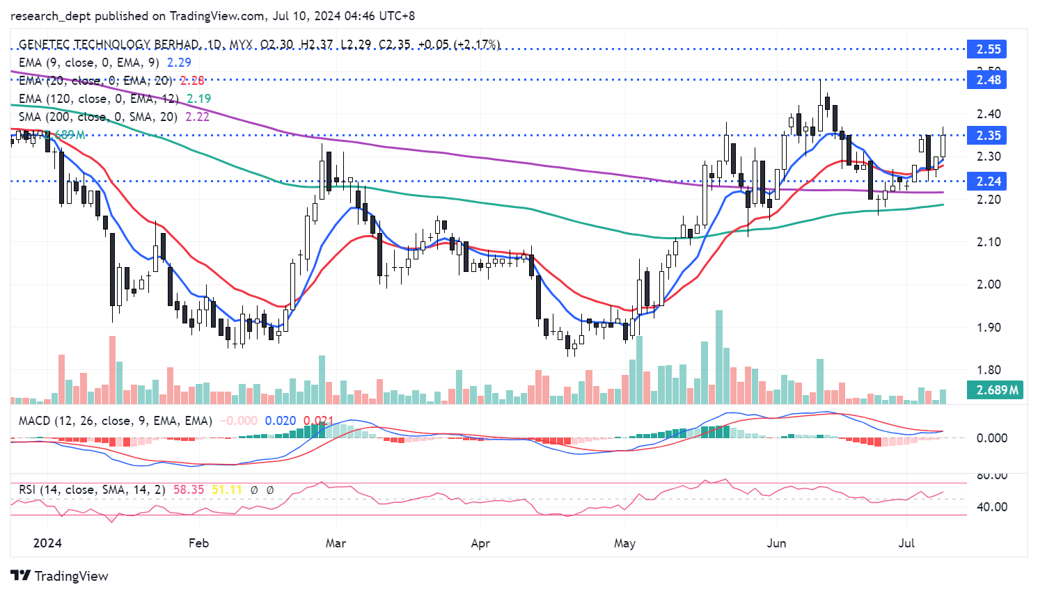 Price has bounced off EMA120 twice in recent months. The uptrend formation was recently reestablished as price advanced above EMA9. Traders may anticipate for a potential breakout above RM2.35 to target the next resistances located at RM2.48- 2.55. Downside wise, support is pegged at RM2.24.