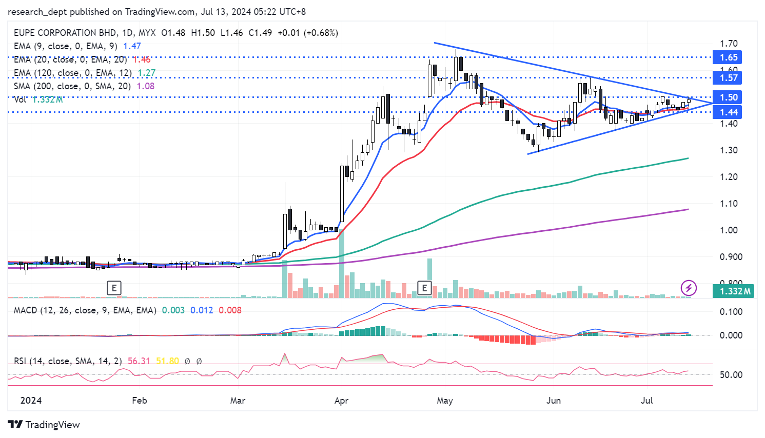 Price has turned into a consolidation pattern, oscillating within the triangle formation in recent months. Price has gapped up and re-tested the upper triangle trendline. Traders may monitor for potential breakout above RM1.50 to target the next resistances located at RM1.57-1.65. Downside wise, support is envisaged at RM1.44.