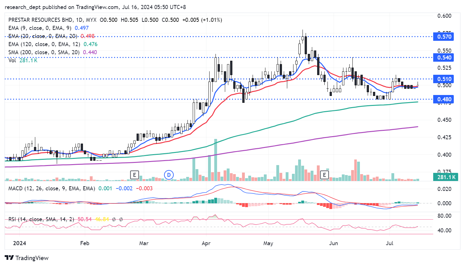 Price has staged a correction after peaking in mid-May 2024. Since then, price has turned into a short term consolidation. Traders may monitor for potential breakout above RM0.51 to target the next resistances located at RM0.54-0.57. Downside wise, support is envisaged at RM0.48.