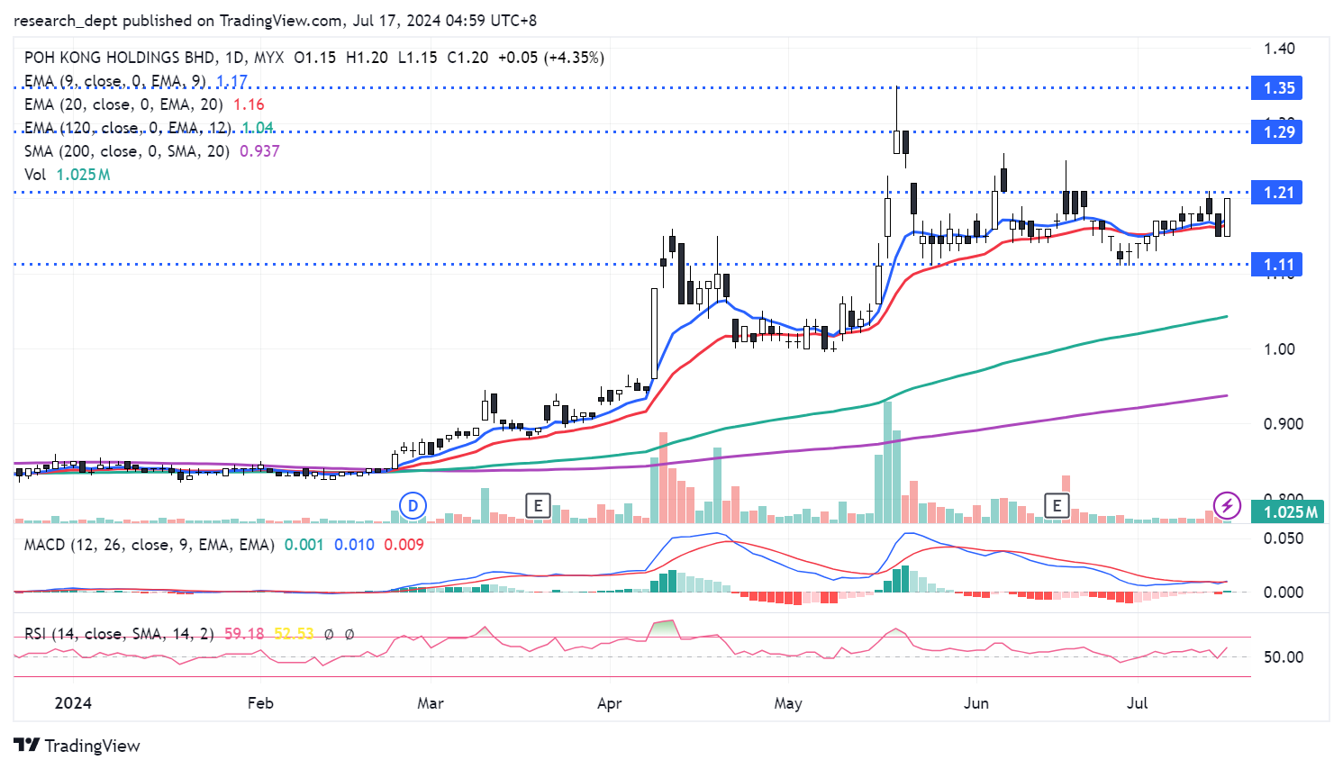 Price has turned into a consolidation pattern in recent months after peaking in mid-May 2024. Still, the uptrend formation remains intact and price has crept marginally higher in recent weeks. Price has formed a bullish candle to close above EMA9 yesterday. Traders may monitor for potential breakout above RM1.21 to target the next resistances located at RM1.29-1.35. Downside wise, support is envisaged at RM1.11.