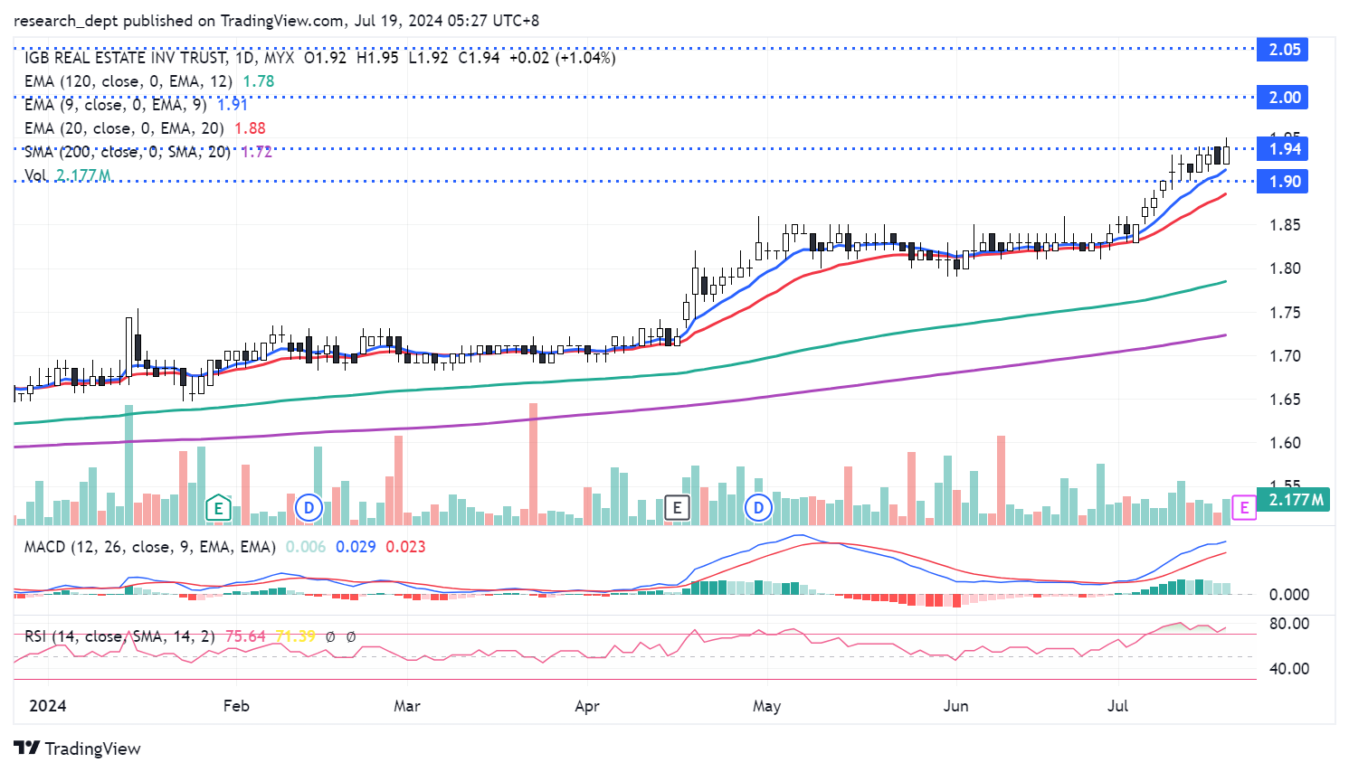 Price is on the uptrend formation and largely supported above EMA20 in recent months. Price has turned into a consolidation pattern in recent weeks as the mild rally took a breather. Traders may monitor for potential short-term breakout above RM1.94 to target the next resistances located at RM2.00-2.05. Downside wise, support is envisaged at RM1.90.