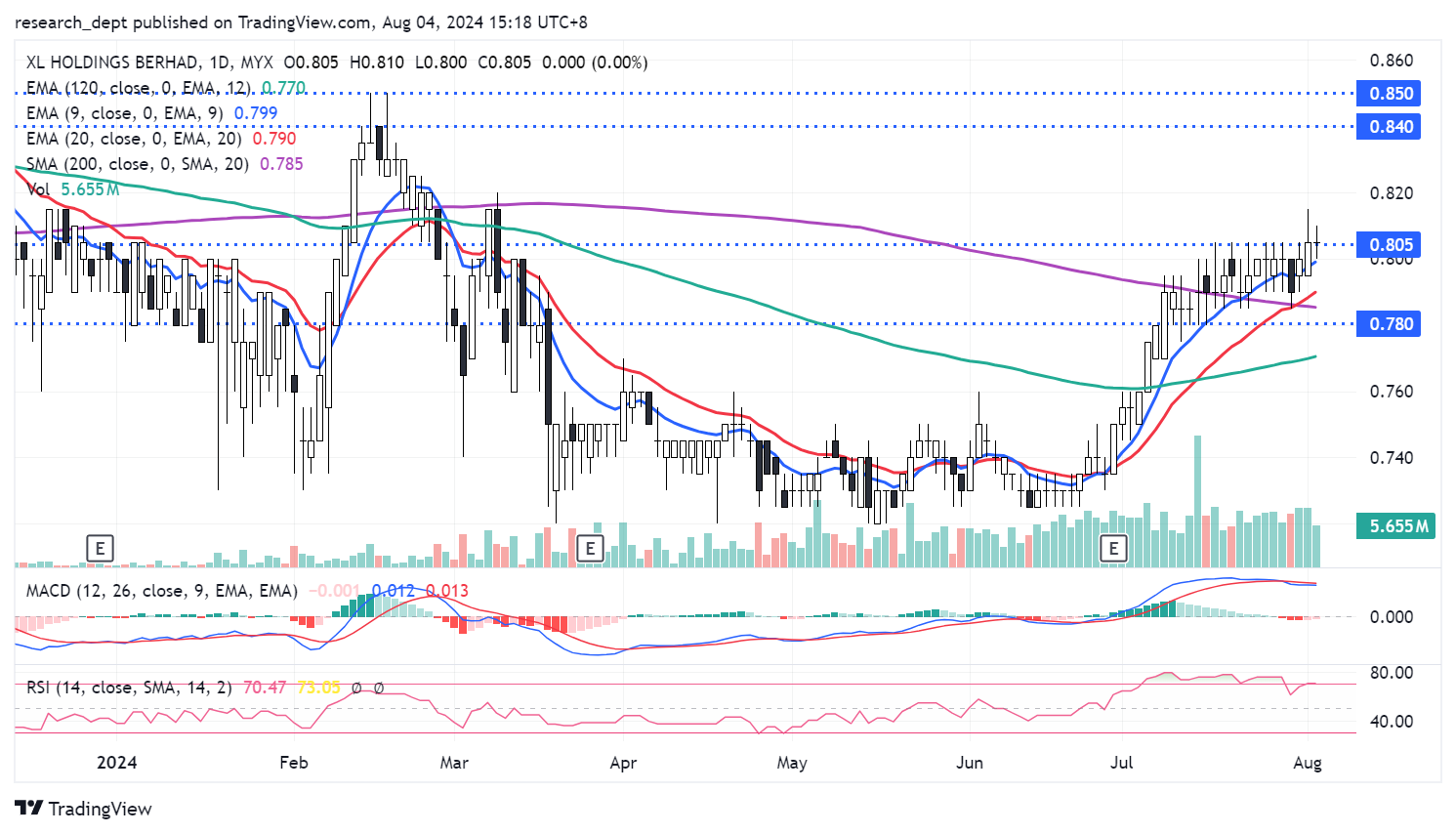 Price apprears to have bottomed out in recent months before recovering and steading above EMA9. With price stabilising above SMA200 in recent weeks, the consolidation pattern was established. Traders may monitor for potential breakout above RM0.805 to target the next resistances located at RM0.84-0.85. Downside wise, support is envisaged at RM0.78.