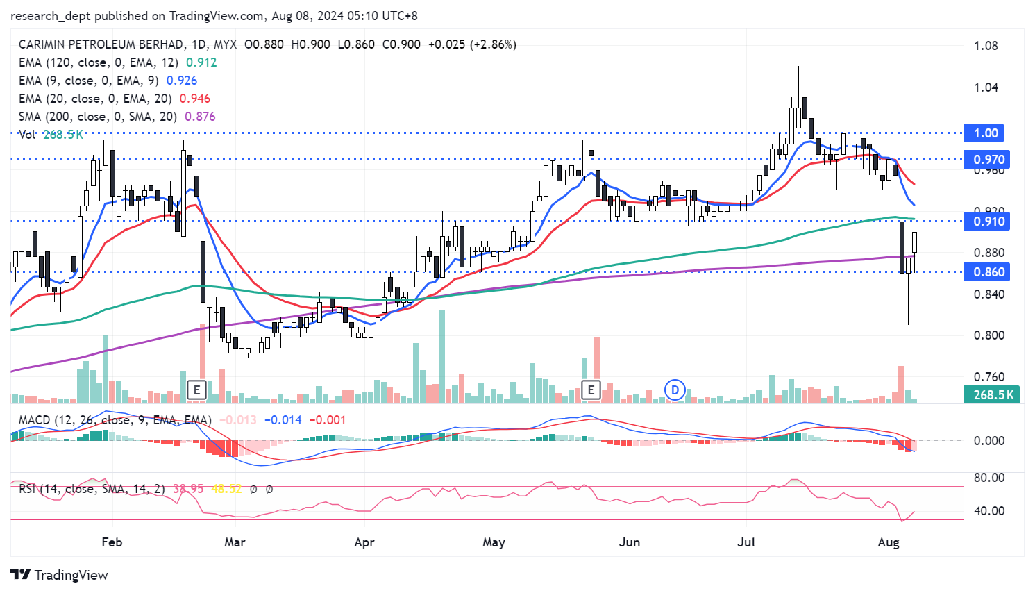 After charging higher since bottoming out in March 2024, the rally took a tumble as price briefly dipped below SMA200. Price formed a hammer candle and a quick rebound above SMA200. For now, traders may monitor for a potential extension of rebound above RM0.91 to target the next resistances located at RM0.97- 1.00. Downside wise, support is pegged at RM0.86.