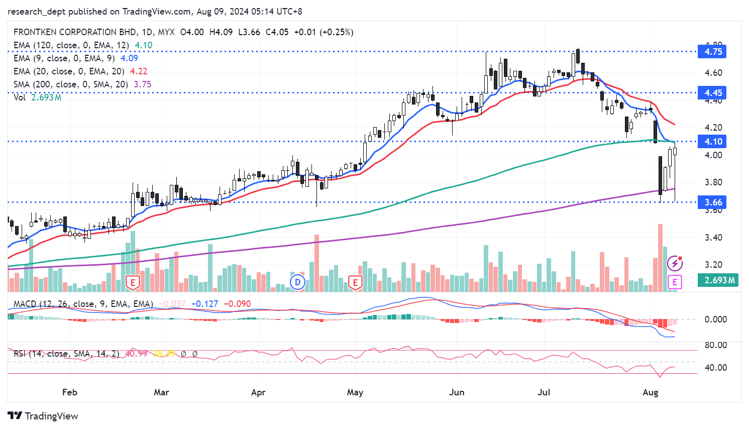 Price took a correction towards SMA200 recently before councing off. With the recent recovery, price is now re-testing EMA120. Traders may monitor for potential extension of recovery above RM4.10 to target the next resistances located at RM4.45-4.75. Downside wise, support is envisaged at RM3.66.
