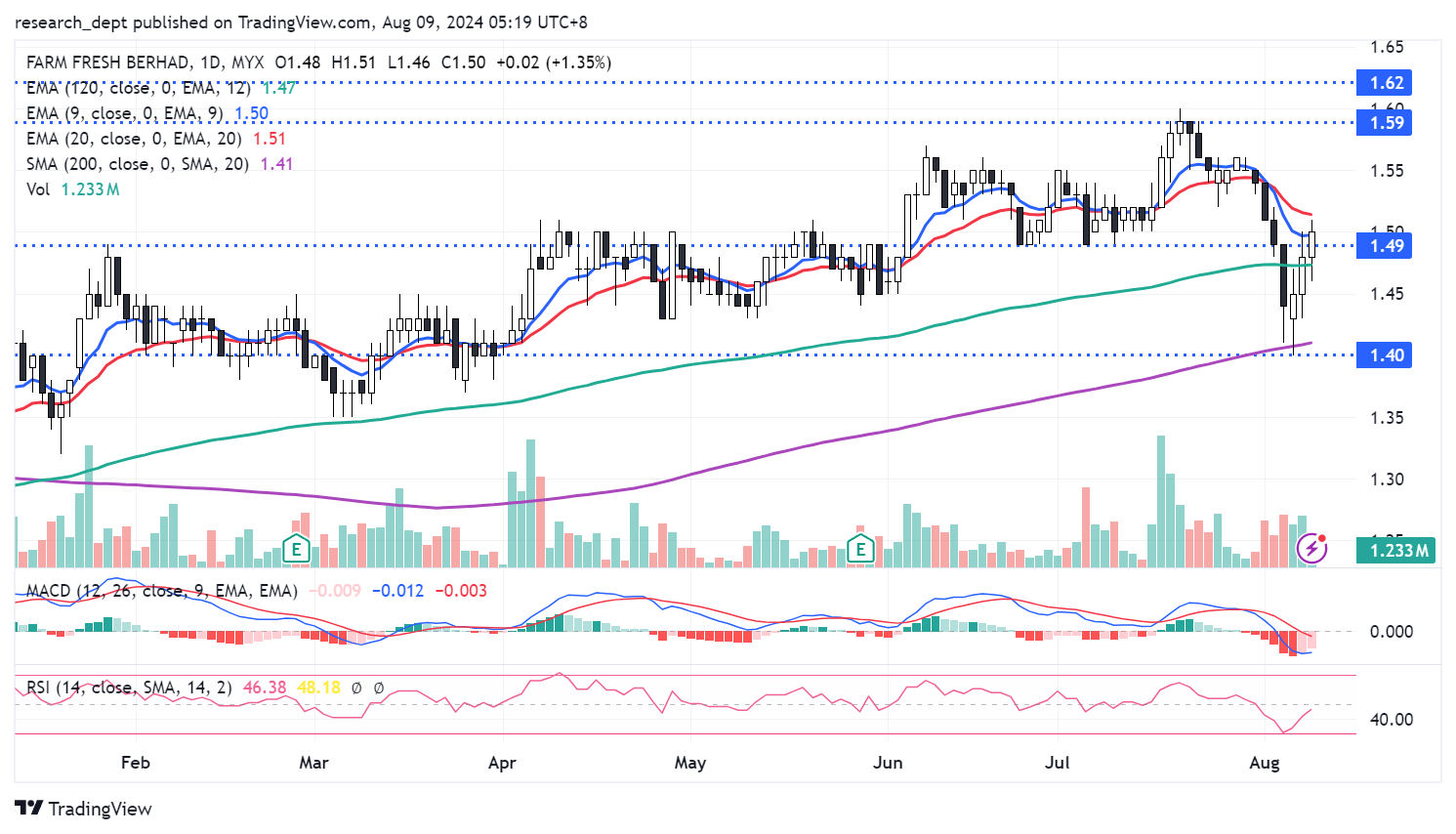 After staged a pullback, price bounced off SMA200. Price formed a three white soldiers formation and breakthrough above RM1.49. Following the swift recovery above EMA9 and RM1.49, price may advance target the next resistances located at RM1.59-1.00. Downside wise, support is pegged at RM1.62.