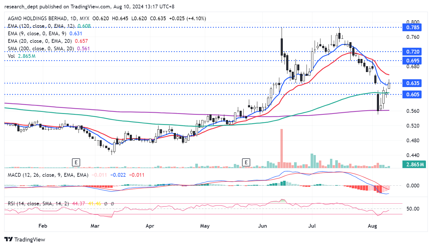 Price has formed a double top format ion at RM0.785 before staging a sharp correction. Price subsequently bounced off SMA200 to recover above EMA9. For now, traders may monitor an extension of recovery above RM0.675 to target the next resistances located at RM0.695-0.72. Downside wise, support is pegged at RM605.