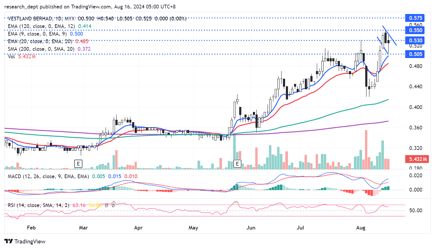 Price is still on the uptrend formation, depsite bouts of volatility. Price has recently stabilised above EMA9 and traders may anticipate for a potential flagformation breakout above RM0.53 to target the next resistances located at RM0.55-0.575. Downside wise, support is pegged at RM0.505.