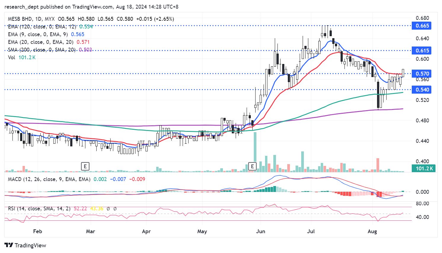 Price has formed a retracement after peaking i n early July 2024. Following the recent correction, price has bounced off SMA200 before recovering above all its moving average lines. With the short-term breakout above RM0.57, price may advance t o target the next resistances located at RM0.615-0.665. Downside wise, support is pegged at RM0.54.