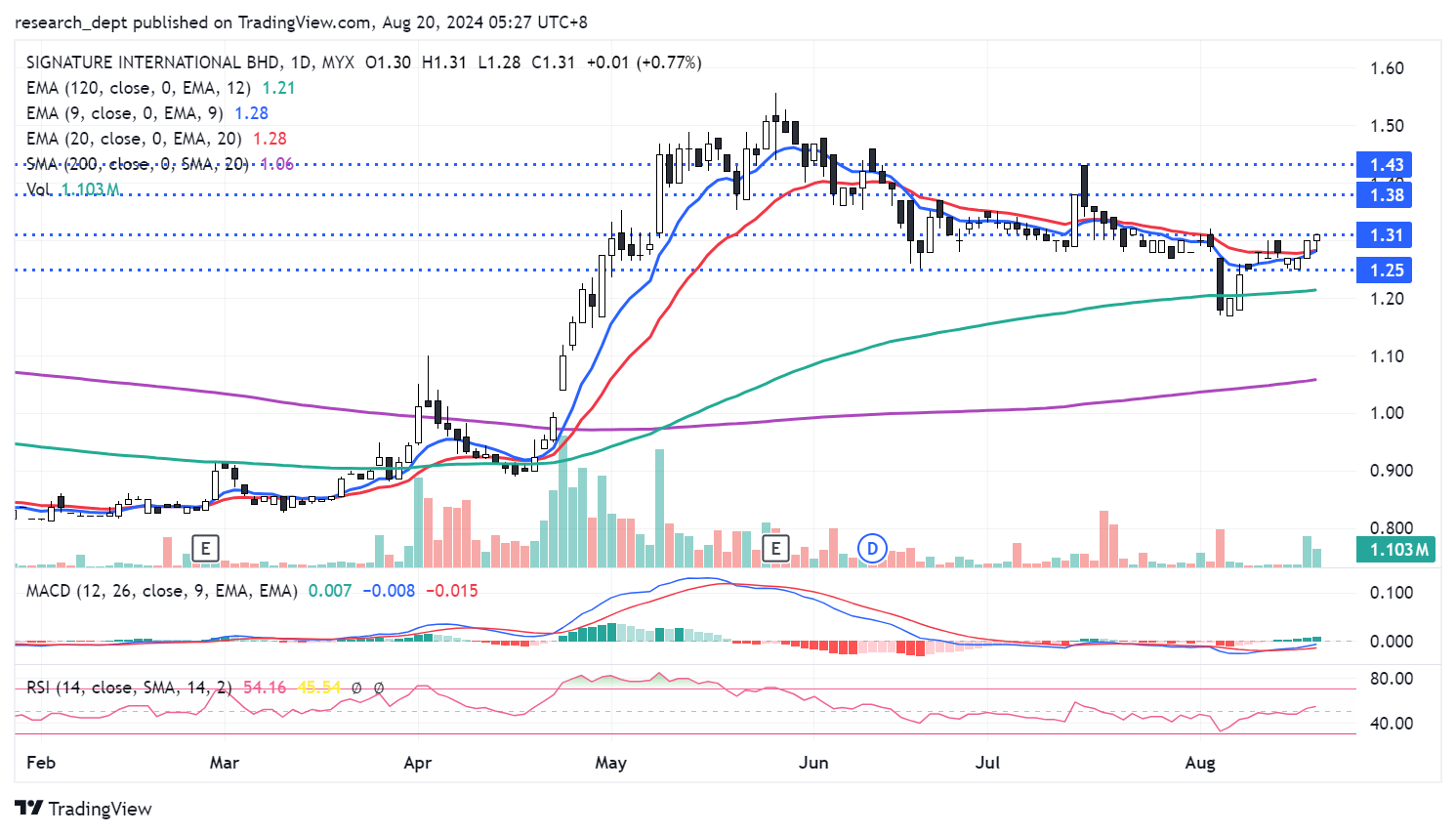 After charging sharply higher and peaked in May 2024, price experienced a multi-month long correction. Price managed to find stability and bounced off EMA120 before turning into a short term consolidation. Traders may monitor for a potential breakout above RM1.31 to target the next resistances located at RM1.38- 1.43. Downside wise, support is envisaged at RM1.25.
