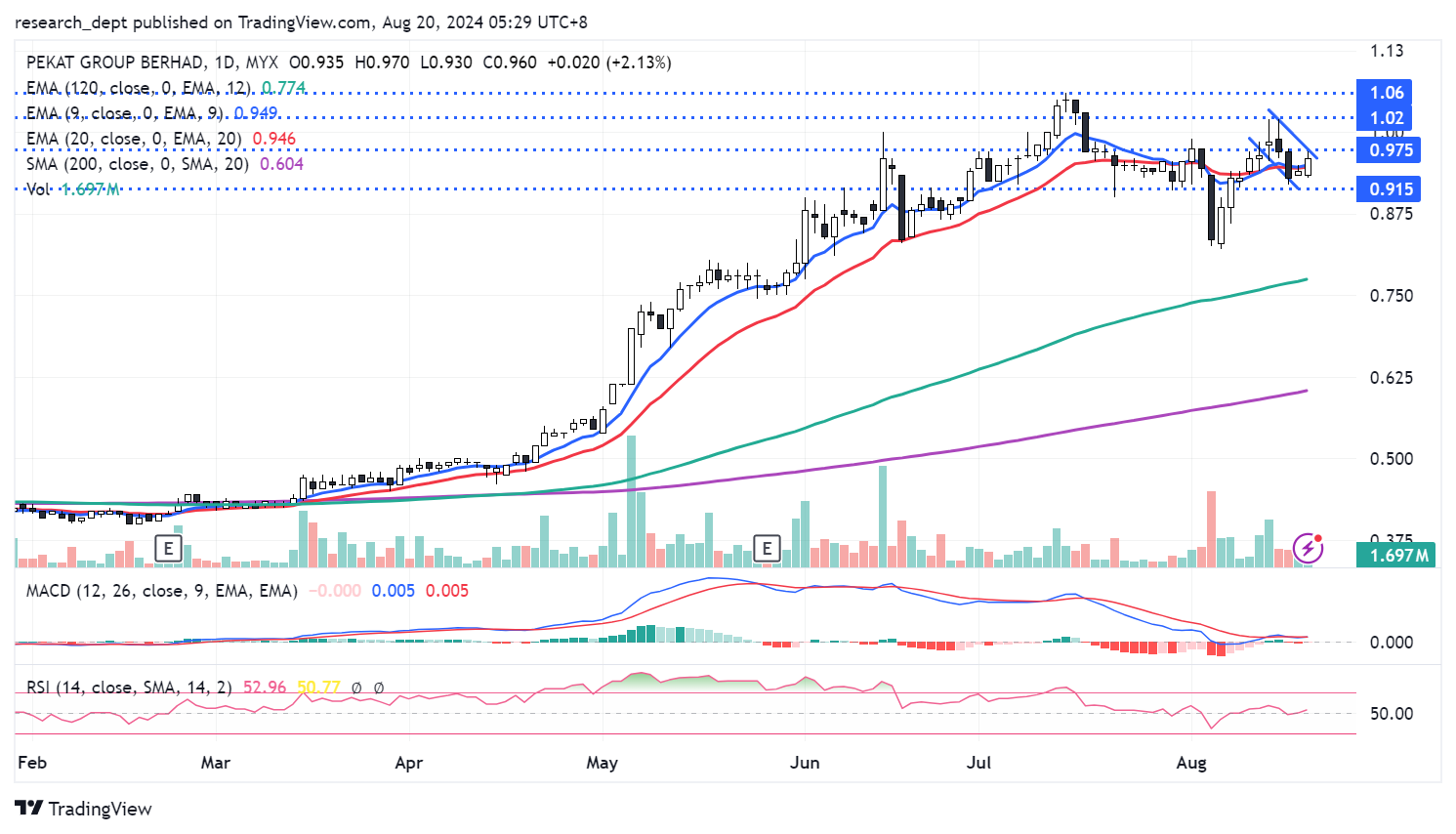 Price has delivered an upbeat performance since the start of the year. Following the recent pullback, price staged a swift recovery and the uptrend formation was re-established. Traders may monitor for a potential flag-formation breakout above RM0.975, to target the next resistances located at RM1.02-1.06. Downside wise, support is pegged at RM0.915.