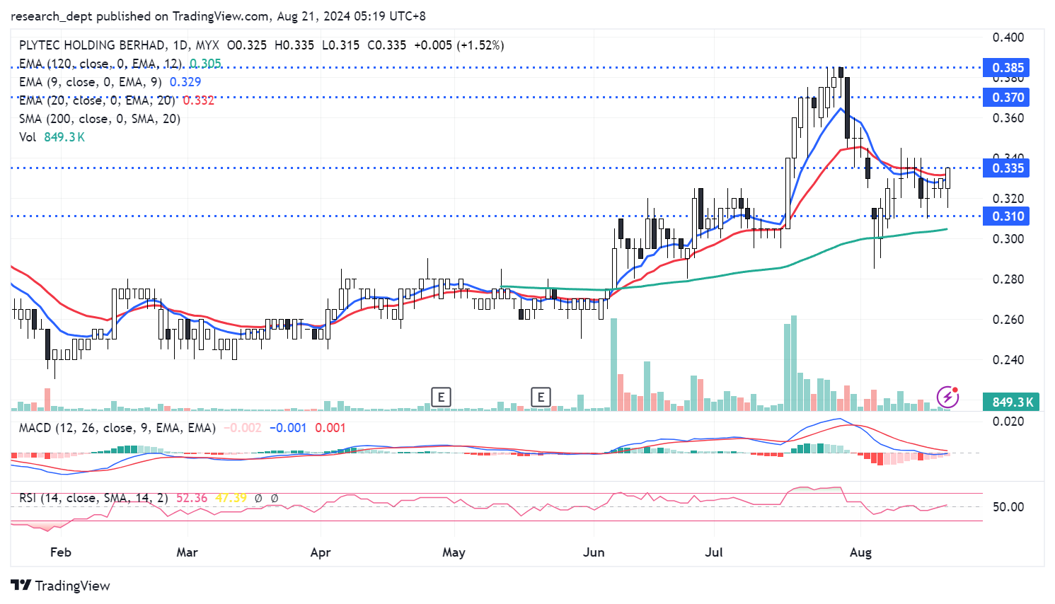 After a two month long rally, price staged a sharp correction. Price formed a hammer candle and bounced off EMA120 before turning into a short-term consolidation around EMA20. Traders may monitor for a potential breakout above RM0.335, t o target the next resistances located at RM0.37- 0.385. Downside wise, support is pegged a t RM0.31.