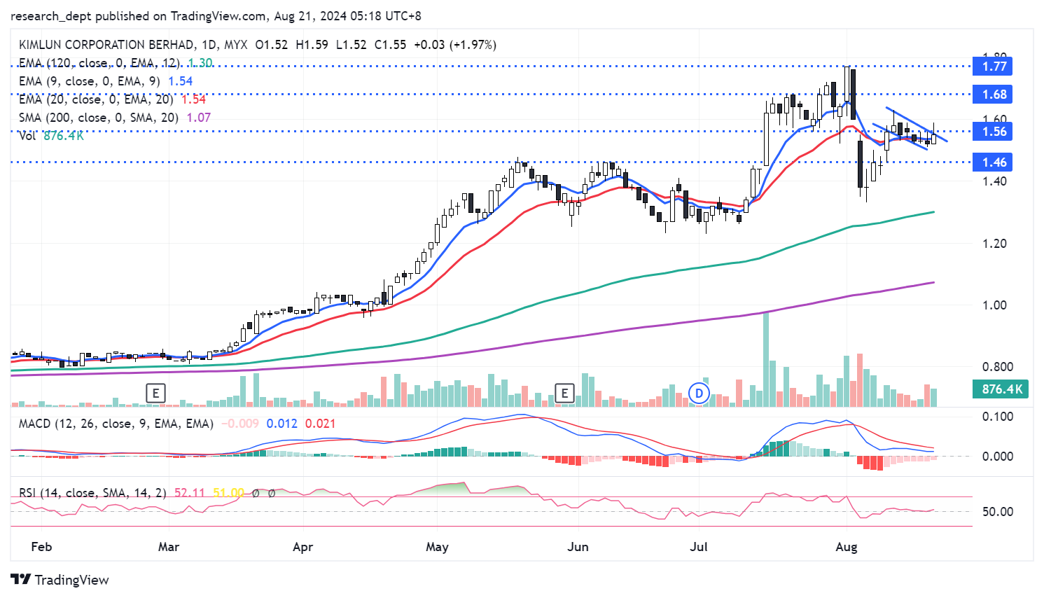 Price has charged higher since mid-March 2024 before peaking in late July 2024. Price subsequently experienced a sharp pullback before staging a recovery. Coming closer, price has formed a mild pullback and traders may anticipate for a potential flag-formation breakout above RM1.56 t o target the next resistances located at RM1.68- 1.77. Downside wise, support is envisaged at RM1.46.
