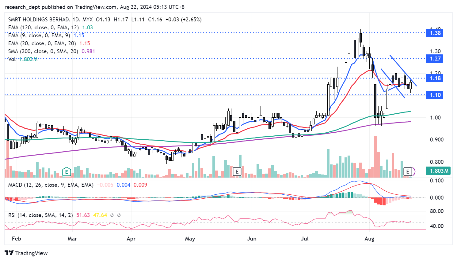 Price recently bounced off SMA200 and formed a recovery pattern. Following the brief rebound, price staged a mild pullback and formed a bullish candle yesterday. For now, traders may anticipate for a potential flag-formation breakout above RM1.18 to target the next resistances located at RM1.27- 1.38. Downside wise, support is envisaged at RM1.10.