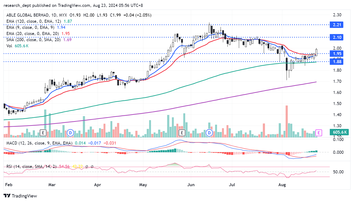 After peaking in June 2024, price experienced a correction and briefly dipped below EMA120. Price subsequently established a rebound and formed a short-term breakout above RM1.95. Price may charge higher to target the next resistances located at RM2.10- 2.21. Downside wise, support is envisaged at RM1.88.