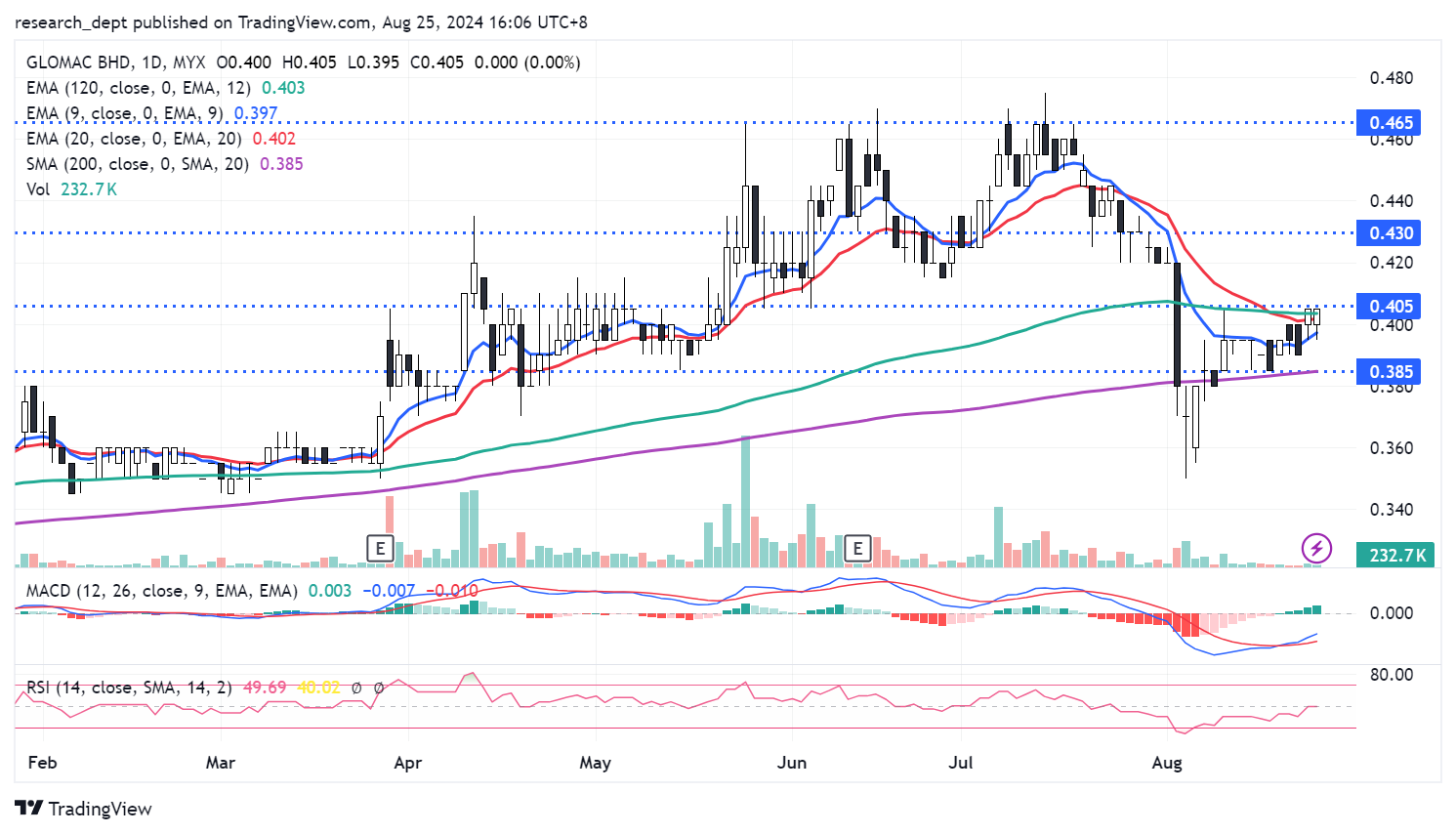 Price has hit some resistances in recent months before staging a pullback. After briefly fallen below SMA200, price has rebounded and turned into a short-term consolidation. With trading activities building up, traders may monitor for a potential breakout above RM0.405, and target the next resistances located at RM0.43-0.465. Downside wise, support is pegged at RM0.385.