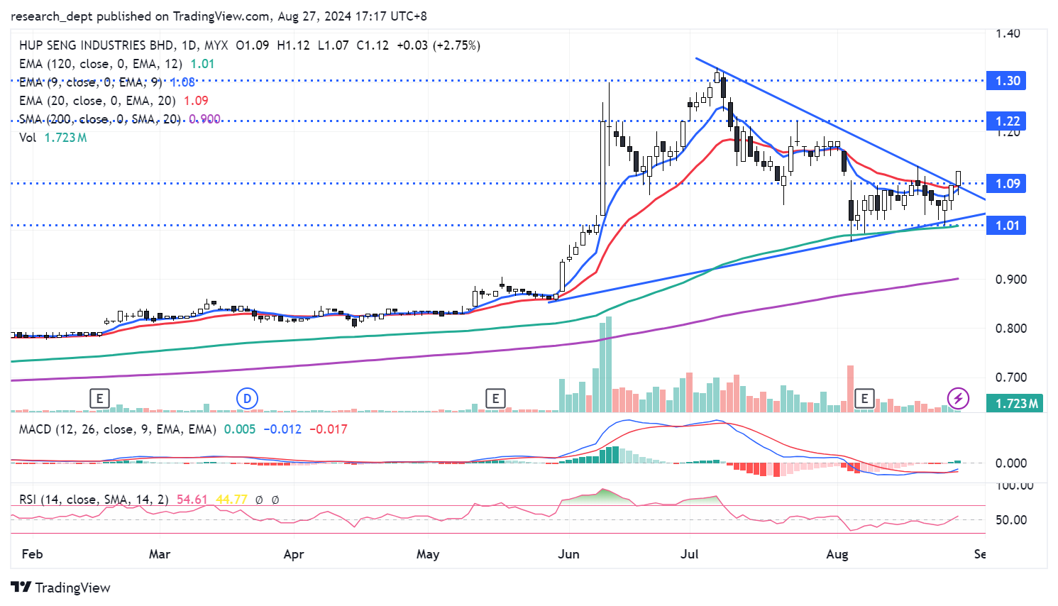 Price has staged a pullback towards EMA120 recently. Price subsequently turned into a consolidation over the past month. With price charging higher over the past three sessions, price experienced a symmetrical triangle breakout above RM1.09 and may advance to target the next resistances located at RM1.22-1.30. Downside wise, support is pegged at RM1.01.