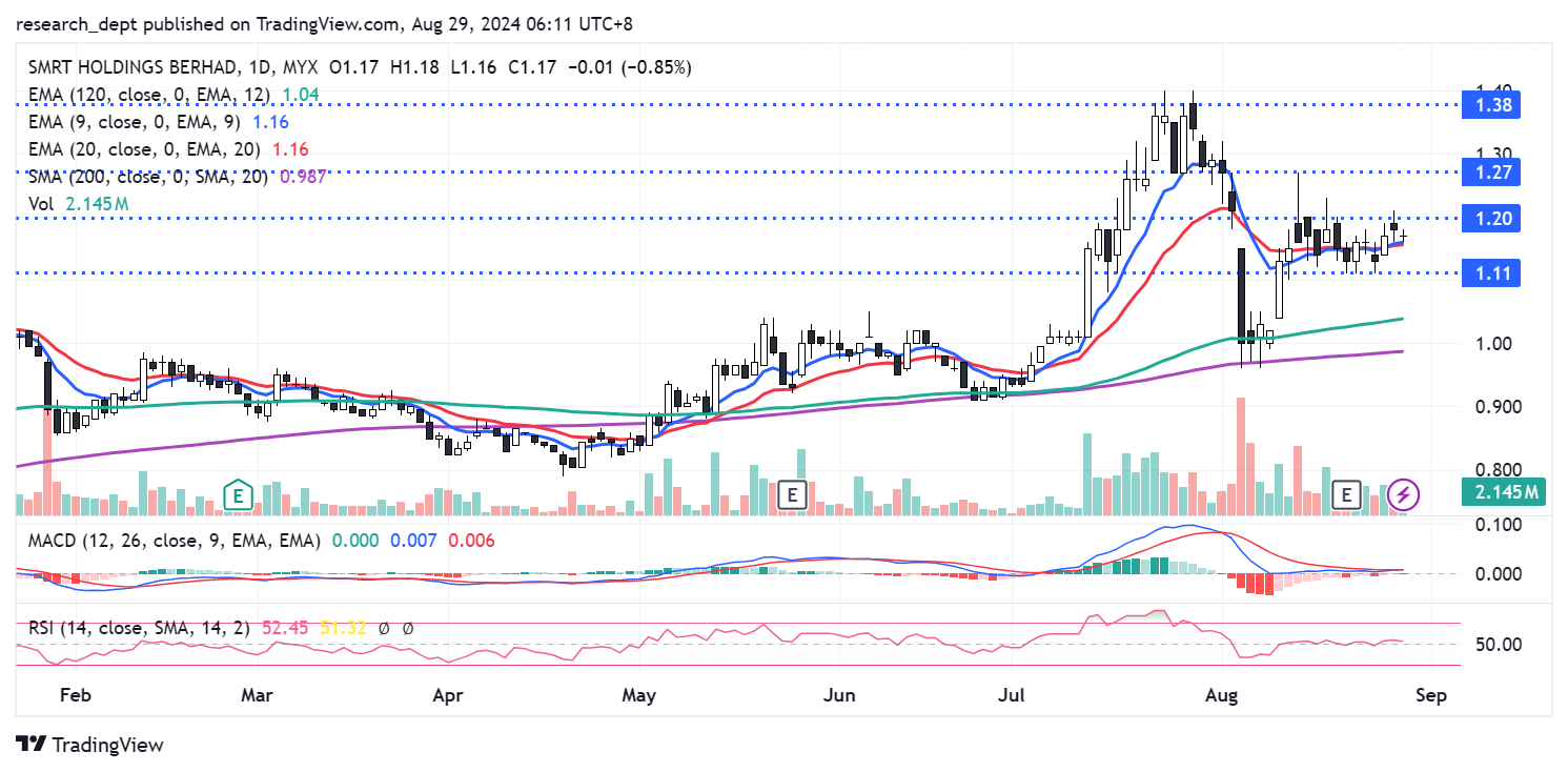 Price has staged a sharp rally since early July 2024 before erasing all its gains. Following the recovery above SMA200, price has turned into a consolidation pattern in recent weeks. Traders may monitor for a potential breakout above RM1.20 to target the next resistances located at RM1.27-1.38. Downside wise, support is pegged at RM1.11.