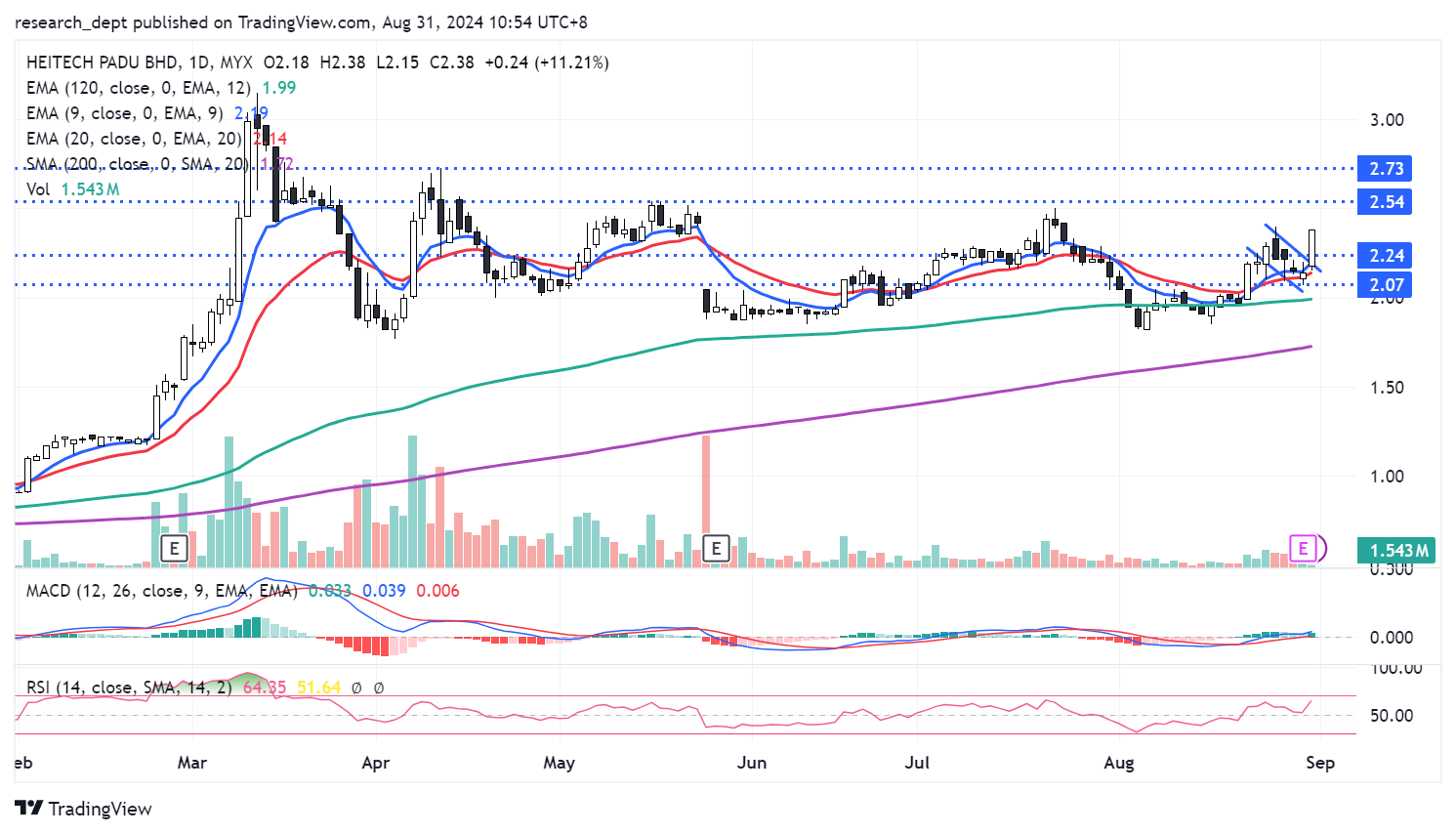 Price has turned into a multi-month long of consolidation. Coming closer, price has recovered above EMA20 and the uptrend formation was established. Price has experienced a flag-formation breakout above RM2.24 and may advance to target the next resistances located at RM2.54-2.73. Downside wise, support is envisaged at RM2.07.