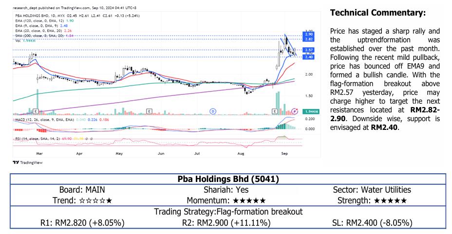 Price has staged a sharp rally and the uptrendformation was established over the past month. Following the recent mild pullback, price has bounced off EMA9 and formed a bullish candle. With the flag-formation breakout above RM2.57 yesterday, price may charge higher to target the next resistances located at RM2.82 2.90. Downside wise, support is envisaged at RM2.40.