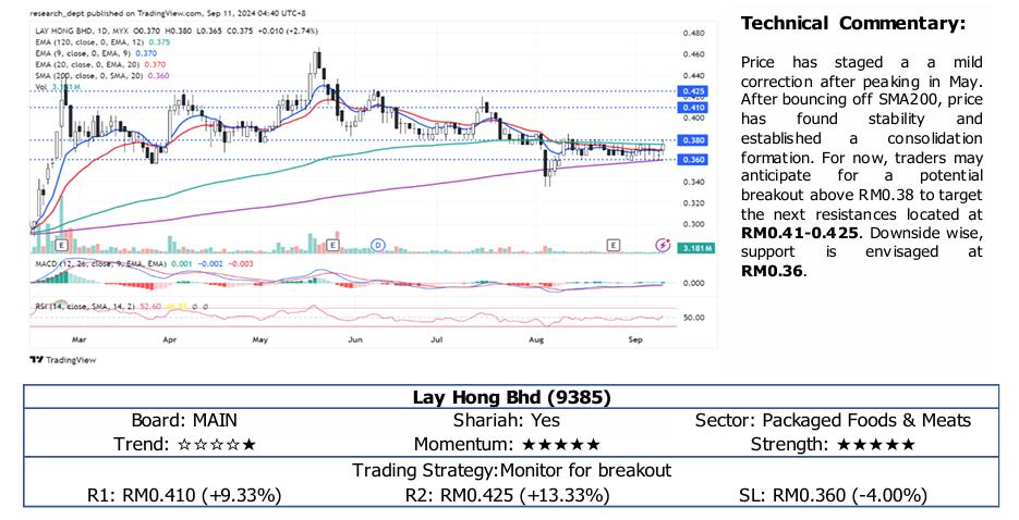 Price has staged a a mild correction after peaking in May. After bouncing off SMA200, price has found established stability a and consolidation formation. For now, traders may anticipate for a potential breakout above RM0.38 to target the next resistances located at RM0.41-0.425. Downside wise, support is envisaged at RM0.36.