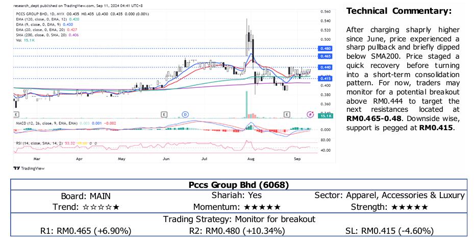 After charging shaprly higher since June, price experienced a sharp pullback and briefly dipped below SMA200. Price staged a quick recovery before turning into a short-term consolidation pattern. For now, traders may monitor for a potential breakout above RM0.444 to target the next resistances located at RM0.465-0.48. Downside wise, support is pegged at RM0.415.
