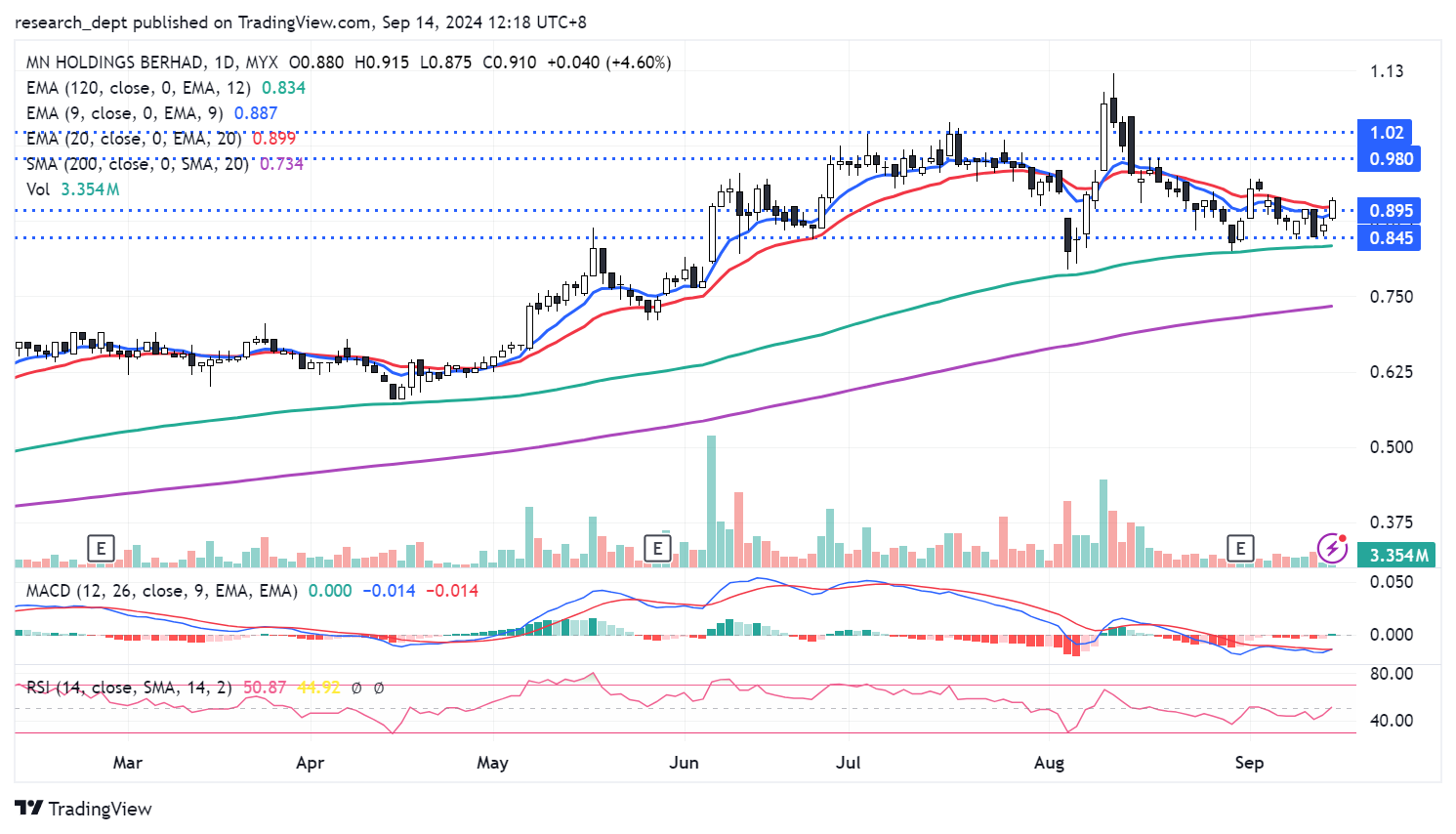 Price has formed a multi-month rally before peaking last month. A mild pullback took place with price largely supported above EMA120 in recent months. Following the gap up format ion last Friday, pr ice experienced a short-term breakout above RM0.895 and may advance to target the next resistances located at RM0.98-1.02. Downside wise, support is pegged at RM0.845.