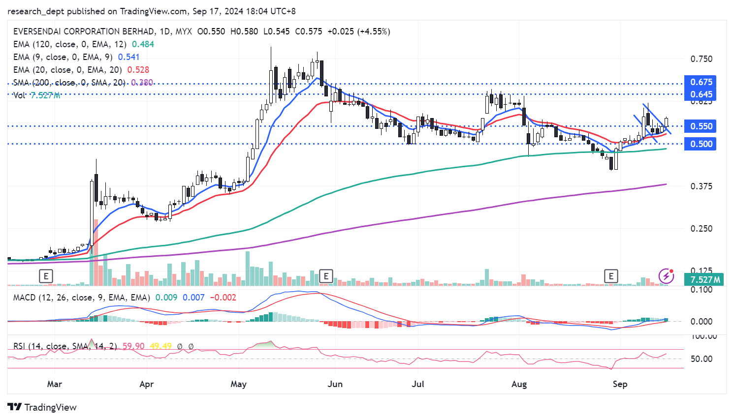 Price has formed a multi-month long of correction since peaking in May. After briefly slipping below EMA120, price staged a quick recovery and the uptrend formation was re-established. With price forming a flag formation breakout above RM0.55, price may head higher t o target the next resistances located a t RM0.645-0.675. Downside wise, support is envisaged at RM0.50.
