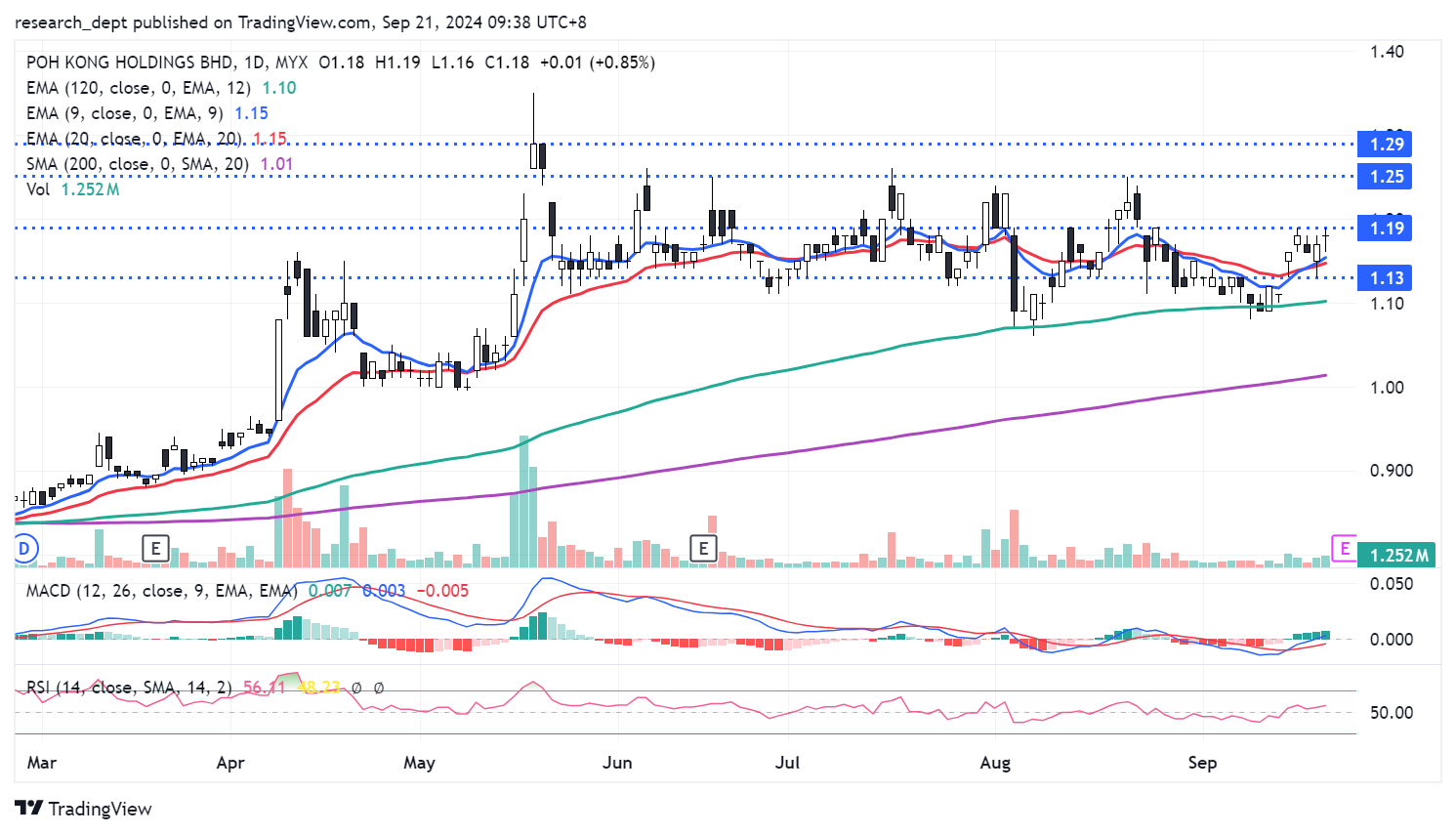 Price has turned into a consolidation pattern i n recent months. After bouncing off EMA120 twice recently, price has rebounded and the uptrend formation was re-established. For now, traders may monitor for a potential breakout above RM1.19 t o target the next resistances located at RM1.25- 1.29. Downside wise, support is envisaged at RM1.13.