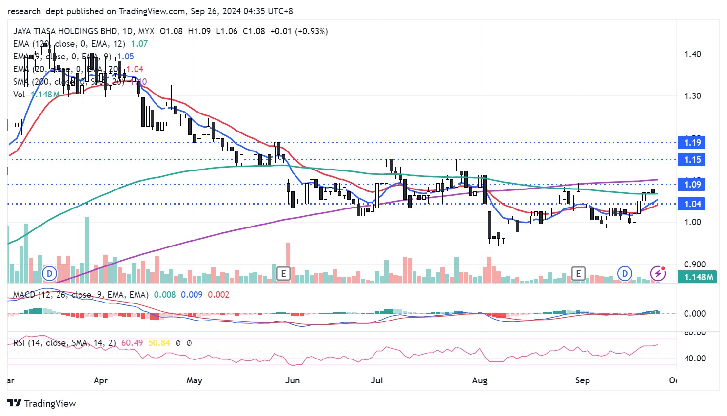 Price appears to have bottomed after multi-month long of correction since peaking in March. Coming closer, price has crept and remained above EMA120 in recent days. Traders may anticipate for a potential breakout above RM1.09 to target the next resistances located at RM1.15-1.19. Downside wise, support is envisaged at RM1.04.