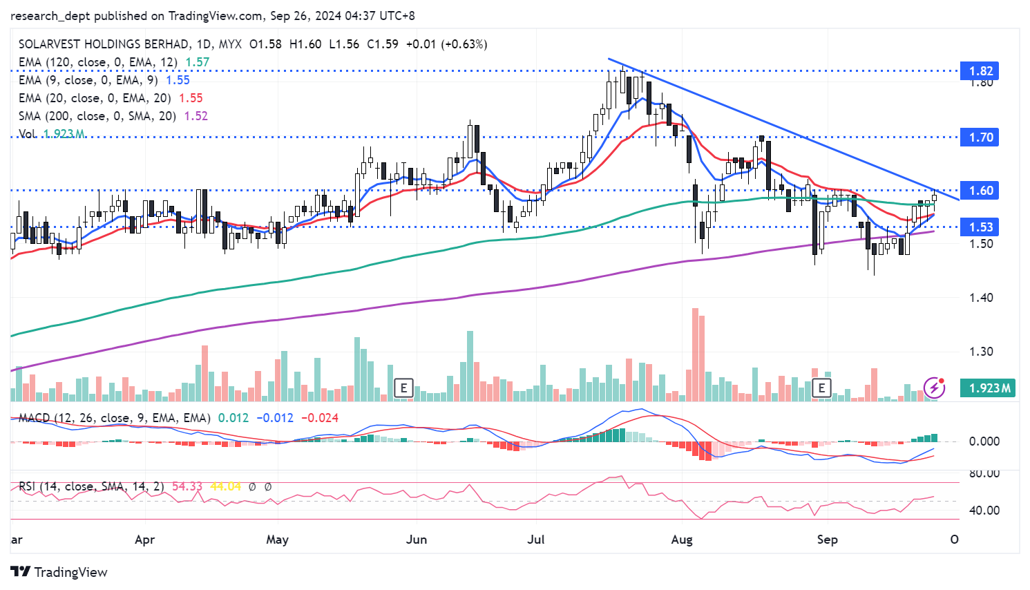 After the sharp correction since July, has found stability and recovered above SMA200. Coming closer, price advanced above EMA120 and formed several hammer candles recently. Traders may anticipate for a potential trendline breakout above RM1.60 to target the next resistances located at RM1.70-1.82. Downside wise, support is pegged at RM1.53.