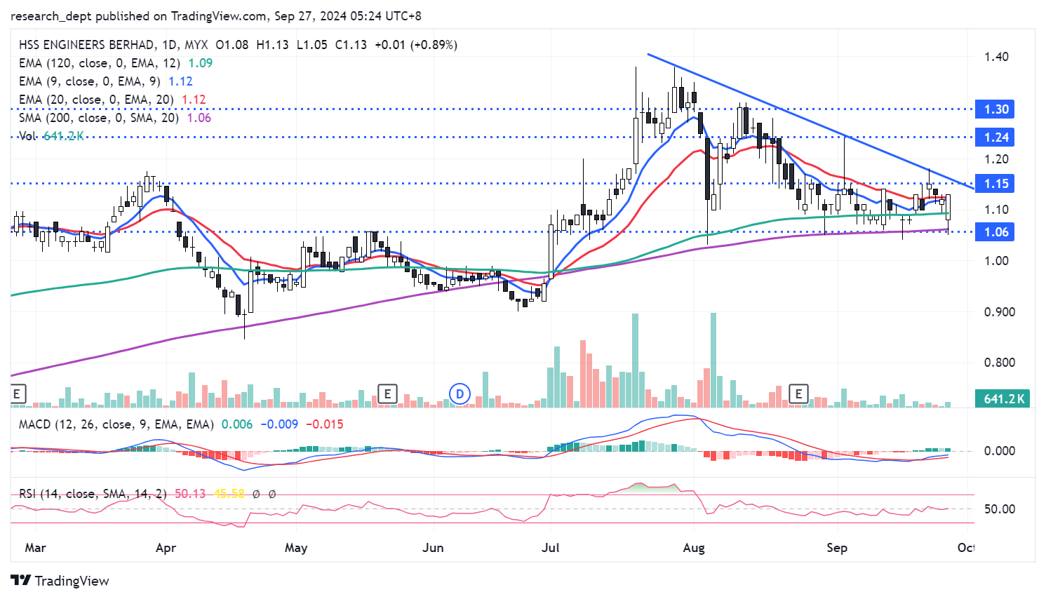 Price staged a correction mode in recent months, but was largely supported above SMA200 on multiple occasions. Since then, price appears to be forming a consolidation. For now, price has formed a bullish candle and bounced off SMA200 again. Following the setup, traders may anticipate for a potential trendline breakout above RM1.15 to target the next resistances located at RM1.24-1.30. Downside wise, support is envisaged at RM1.06.