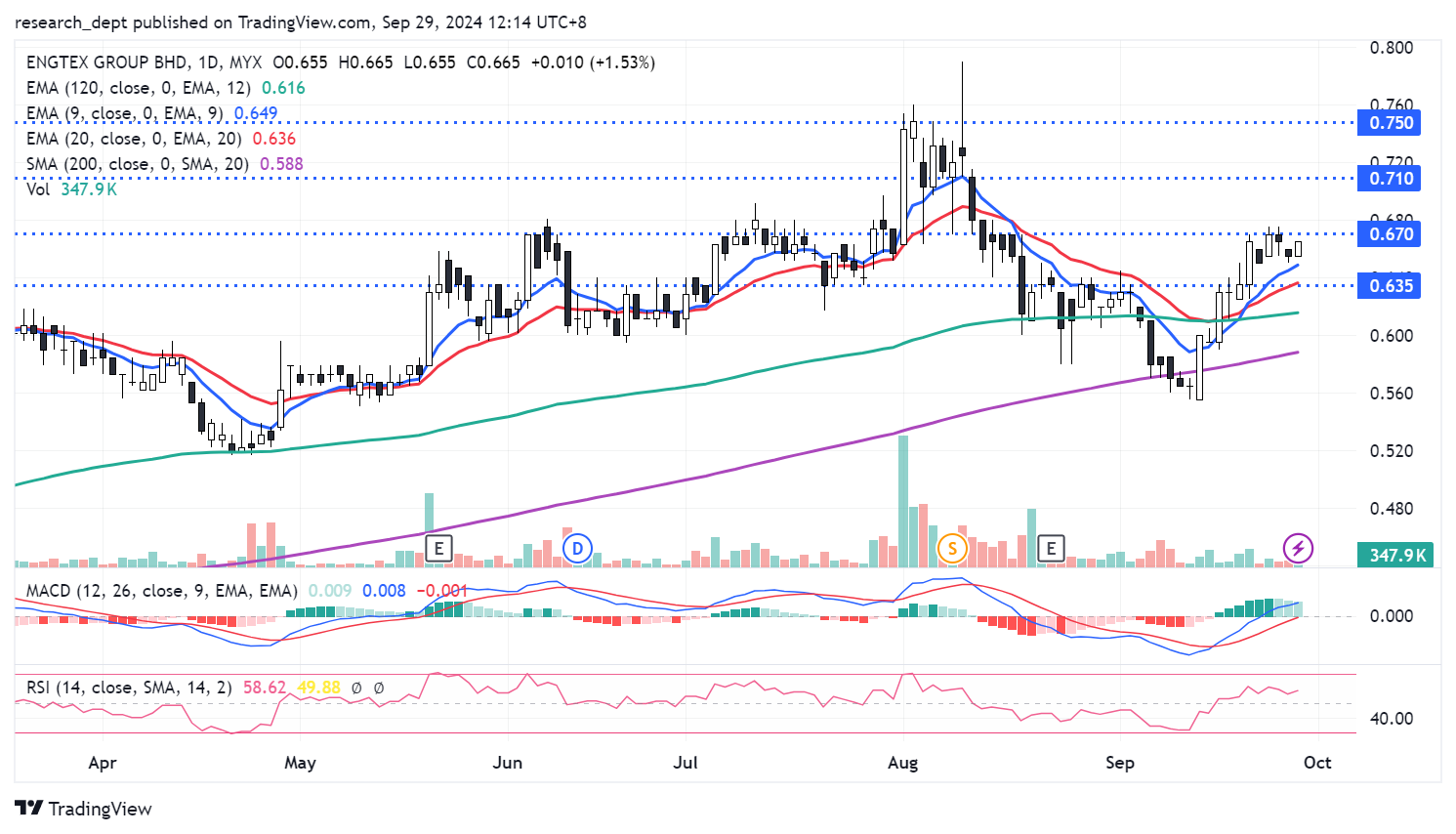 Price staged a correction and bounced off SMA200 recently. A swift recovery took place and the uptrend formation was established. Price subsequently turned into a short term consolidation and traders may anticipate for a potential breakout above R M0.67 t o target the next resistances located at RM0.7 1-0.7 5. Downside wise, support is envisaged